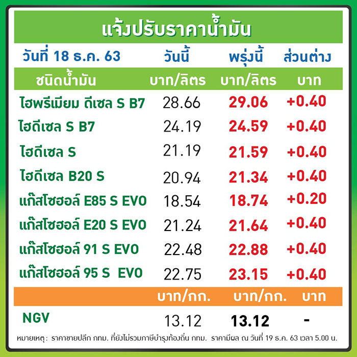 บมจ.ปตท.น้ำมันและการค้าปลีก (OR) ในกลุ่ม บมจ.ปตท. (PTT) และ บมจ.บางจาก คอร์ปอเรชั่น (BCP) ประกาศปรับขึ้นราคาขายปลีกน้ำมันทุกชนิด 40 สต. เว้น E85 ขยับ 20 สต. มีผลพรุ่งนี้ (19 ธ.ค. 2563) เวลา 05.00 น. เป็นต้นไป ทั้งนี้ จะส่งผลให้ราคาน้ำมันขายปลีกในกรุงเทพเป็นดังนี้ ดีเซล อยู่ที่ลิตรละ 21.59 บาท ดีเซล B7 อยู่ที่ลิตรละ 24.59 บาท ดีเซล B20 อยู่ที่ลิตรละ 21.34 บาท แก๊สโซฮอล์ 95 อยู่ที่ลิตรละ 23.15 บาท แก๊สโซฮอล์ 91 อยู่ที่ลิตรละ 22.88 บาท E20 อยู่ที่ลิตรละ 21.64 บาท E85 อยู่ที่ลิตรละ 18.74 บาท และเบนซิน เฉพาะปตท. อยู่ที่ลิตรละ 30.56 บาท ราคาขายปลีกดังกล่าวในพื้นที่กรุงเทพฯ ยังไม่รวมภาษีบำรุงท้องถิ่น