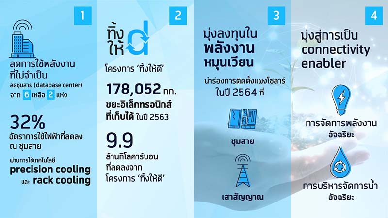 4. การมุ่งพัฒนาเทคโนโลยีดิจิทัลเพื่อการใช้พลังงานอย่างมีประสิทธิภาพ (Connectivity-based Enabler) ในภาคธุรกิจอื่นๆ โดยอุตสาหกรรมโทรคมนาคมนั้นมีบทบาทในการชะลอการเปลี่ยนแปลงสภาพภูมิอากาศอย่างมีนัยสำคัญ ผ่านการใช้เทคโนโลยี machine-to-machine (M2M) หรือที่รู้จักในชื่อ อินเทอร์เน็ตของสรรพสิ่ง (Internet of Things: IoT)’ และการเพิ่มบริการโทรคมนาคมไร้สาย (mobile connectivity) อีกทั้งยังมีศักยภาพในการยกระดับประสิทธิภาพการทำงานและลดการใช้ทรัพยากรธรรมชาติได้มหาศาล โดยเฉพาะในกลุ่มอุตสาหกรรมที่ใช้พลังงานสูงสุด ได้แก่ อาคารและที่อยู่อาศัย พลังงาน ขนส่ง เกษตรกรรม และภาคการผลิต โดยที่ผ่านมา ดีแทคได้ร่วมกับภาคอุตสาหกรรมต่างๆ ในการพัฒนารูปแบบทดสอบการใช้งาน อาทิ การพัฒนาระบบบริหารจัดการน้ำอัจฉริยะ และการพัฒนาระบบบริหารจัดการพลังงานไฟฟ้าอัจฉริยะ ในโรงงานต่างๆ และภาคธนาคารที่ช่วยสร้างเสถียรภาพทางพลังงานและวางแผนการใช้พลังงานได้อย่างมีประสิทธิภาพ