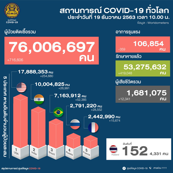 ศูนย์บริหารสถานการณ์ การแพร่ระบาดของโรคติดเชื้อไวรัสโคโรน่า 2019 (โควิด-19) หรือ ศบค. เผยแพร่ความคืบหน้าสถานการณ์ไวรัสโควิด-19 ว่า วันนี้พบผู้ป่วยรายใหม่ 34 คน ยอดรวมผู้ป่วยสะสม 4,331 คน และไม่มีผู้เสียชีวิต จึงมียอดผู้เสียชีวิตคงที่ 60 คน หายป่วยเพิ่มขึ้น 19 คน รวมสะสม 4,024 คน และรักษาอยู่ในโรงพยาบาล 247 คน สำหรับผู้ติดเชื้อรายใหม่ 34 คน เป็นผู้ติดเชื้อภายในประเทศ 12 คนที่จังหวัดสมุทรสาคร ส่วนอีก 22 คน เป็นผู้ติดเชื้อที่เดินทางกลับมาจากต่างประเทศและตรวจพบเชื้อในพื้นที่กักตัวของรัฐ จากประเทศเคนยา 1 คน , ประเทศเยอรมนี 2 คน, สหรัฐอเมริกา 2 คน , ประเทศบาห์เรน 1 คน , สหราชอาณาจักร 4 คน , ประเทศรัสเซีย 1 คน , ประเทศบังกลาเทศ 2 คน , สหรัฐอาหรับเอมิเรตส์ 1 คน , ประเทศไต้หวัน 1 คน , ประเทศนามิเบีย 2 คน , ประเทศเนเธอร์แลนด์ 1 คน , ประเทศซาอุดิอาระเบีย 2 คน , ประเทศอินเดีย 1 คน และประเทศอิตาลี 1 คน ส่วนสถานการณ์ทั่วโลกมีผู้ติดเชื้อโควิคทั้งหมด 76,006,697 คน โดยประเทศสหรัฐอเมริกายังคงเป็นอันดับ 1 ที่มีผู้ติดเชื้อ 17,888,353 คน ส่วนประเทศไทย อยู่ในอันดับที่152 ของโลกมีผู้ติดเชื้อ 4,331 คน