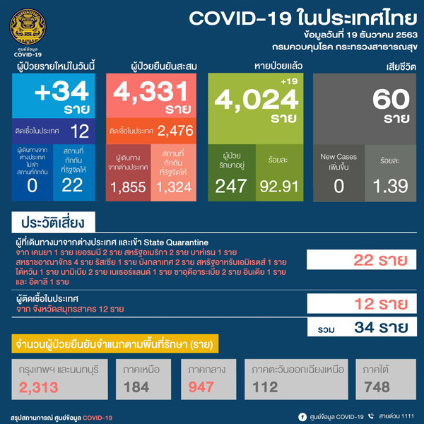 ศูนย์บริหารสถานการณ์ การแพร่ระบาดของโรคติดเชื้อไวรัสโคโรน่า 2019 (โควิด-19) หรือ ศบค. เผยแพร่ความคืบหน้าสถานการณ์ไวรัสโควิด-19 ว่า วันนี้พบผู้ป่วยรายใหม่ 34 คน ยอดรวมผู้ป่วยสะสม 4,331 คน และไม่มีผู้เสียชีวิต จึงมียอดผู้เสียชีวิตคงที่ 60 คน หายป่วยเพิ่มขึ้น 19 คน รวมสะสม 4,024 คน และรักษาอยู่ในโรงพยาบาล 247 คน สำหรับผู้ติดเชื้อรายใหม่ 34 คน เป็นผู้ติดเชื้อภายในประเทศ 12 คนที่จังหวัดสมุทรสาคร ส่วนอีก 22 คน เป็นผู้ติดเชื้อที่เดินทางกลับมาจากต่างประเทศและตรวจพบเชื้อในพื้นที่กักตัวของรัฐ จากประเทศเคนยา 1 คน , ประเทศเยอรมนี 2 คน, สหรัฐอเมริกา 2 คน , ประเทศบาห์เรน 1 คน , สหราชอาณาจักร 4 คน , ประเทศรัสเซีย 1 คน , ประเทศบังกลาเทศ 2 คน , สหรัฐอาหรับเอมิเรตส์ 1 คน , ประเทศไต้หวัน 1 คน , ประเทศนามิเบีย 2 คน , ประเทศเนเธอร์แลนด์ 1 คน , ประเทศซาอุดิอาระเบีย 2 คน , ประเทศอินเดีย 1 คน และประเทศอิตาลี 1 คน ส่วนสถานการณ์ทั่วโลกมีผู้ติดเชื้อโควิคทั้งหมด 76,006,697 คน โดยประเทศสหรัฐอเมริกายังคงเป็นอันดับ 1 ที่มีผู้ติดเชื้อ 17,888,353 คน ส่วนประเทศไทย อยู่ในอันดับที่152 ของโลกมีผู้ติดเชื้อ 4,331 คน