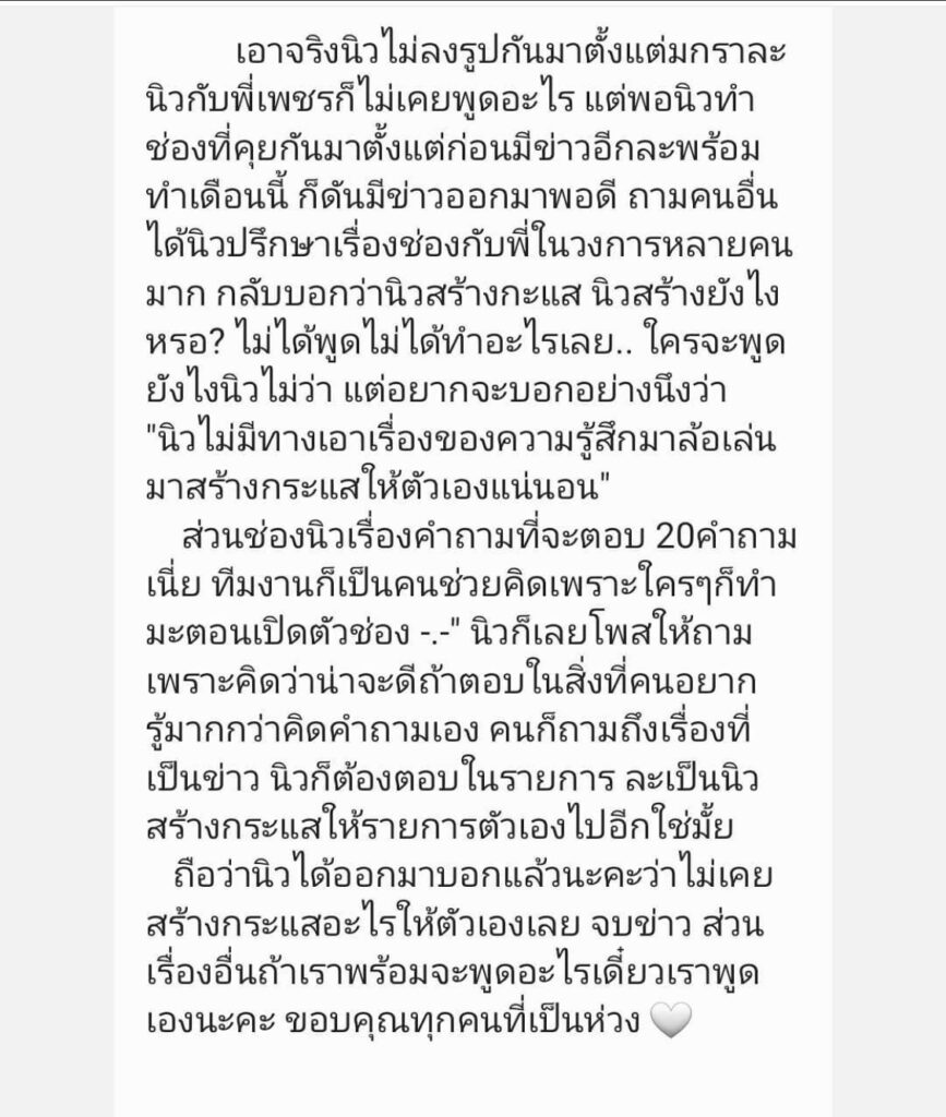 ซึ่งสาวนิวเคลียร์ ยังปิดท้ายอีกว่า เรื่องอื่นหากพร้อมจะพูดเมื่อไหร่จะเป็นฝ่ายออกมาพูดเอง และขอบคุณทุกคนที่เป็นห่วง