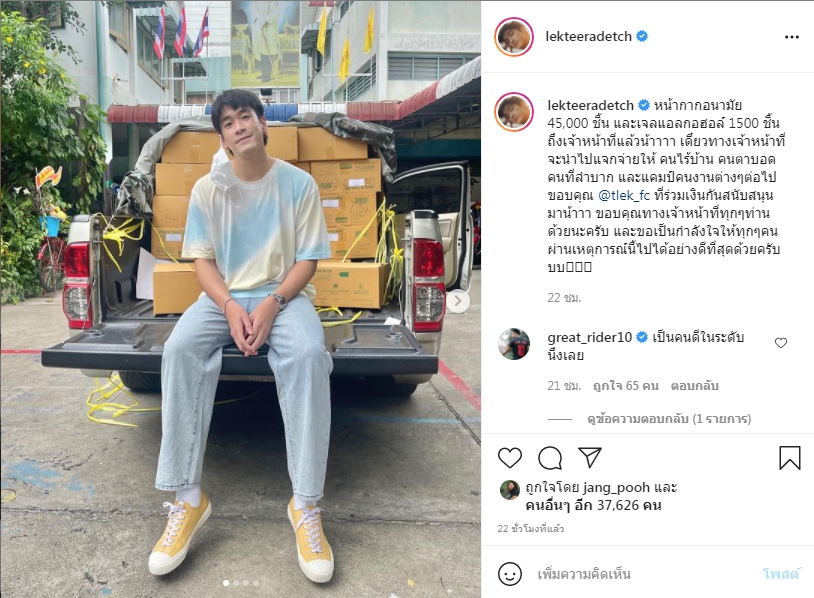 ล่าสุดพระเอกหนุ่ม “อาเล็ก ธีรเดช” ร่วมกับแฟนคลับ มอบหน้ากากอนามัย 45,000 ชิ้น เจลแอลกอฮอล์ 1,500 ชิ้น ส่งให้เจ้าหน้าที่ไปแจกจ่ายให้คนไร้บ้าน คนตาบอด รวมถึงแคมป์คนงานต่างๆโดยได้ลงภาพพร้อมแคปชันว่า