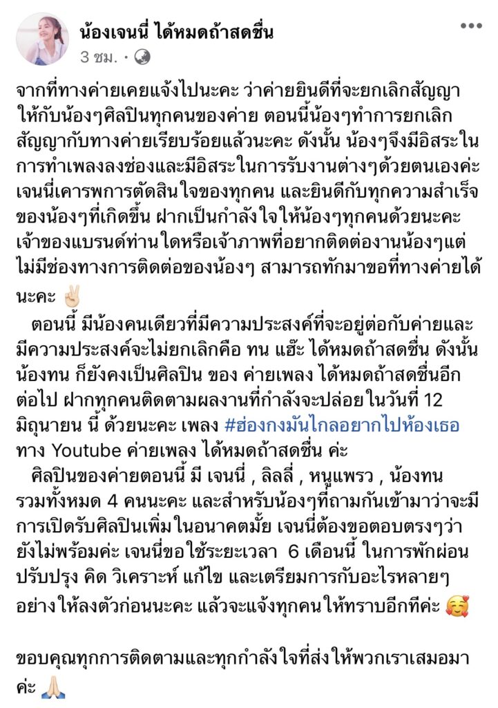 “จากที่ทางค่ายเคยแจ้งไปนะคะ ว่าค่ายยินดีที่จะยกเลิกสัญญาให้กับน้องๆศิลปินทุกคนของค่าย ตอนนี้น้องๆทำการยกเลิกสัญญากับทางค่ายเรียบร้อยแล้วนะคะ ดังนั้น น้องๆจึงมีอิสระในการทำเพลงลงช่องและมีอิสระในการรับงานต่างๆด้วยตนเองค่ะ เจนนี่เคารพการตัดสินใจของทุกคน และยินดีกับทุกความสำเร็จของน้องๆที่เกิดขึ้น ฝากเป็นกำลังใจให้น้องๆทุกคนด้วยนะคะ เจ้าของแบรนด์ท่านใดหรือเจ้าภาพที่อยากติดต่องานน้องๆแต่ไม่มีช่องทางการติดต่อของน้องๆ สามารถทักมาขอที่ทางค่ายได้นะคะ ✌🏻