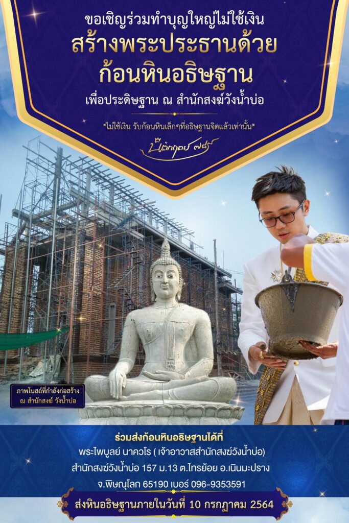 “งานบุญแบบนี้บุ๋มต้องร่วมด้วยเอาด้วย สำหรับใครที่อยากจะร่วมสร้างพระด้วยก้อนหินอธิษฐาน สามารถส่งก้อนหินที่อธิษฐานแล้ว หลังจากสวดมนต์ บทสอนเจ้ากรรมนายเวรหรือ พุทธมนต์บทอื่นๆ ก็ได้ จำนวน 1 ก้อน/คน (ขนาดไม่เกินหนึ่งข้อนิ้วชี้) มาที่ พระไพบูลย์ นาควโร ( เจ้าอาวาสสำนักสงฆ์วังน้ำบ่อ) สำนักสงฆ์วังน้ำบ่อ 157 ม.13 ต.ไทรย้อย อ.เนินมะปราง จ.พิษณุโลก 65190” 096-9353591