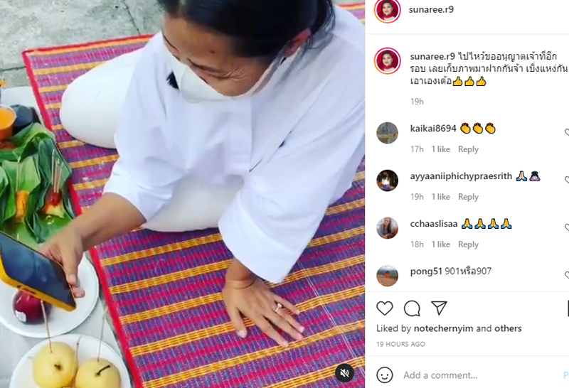 ล่าสุด สุนารี จุดธูป ขออนุญาตเจ้าที่อีกรอบ พร้อมเผยเลขธูปที่ให้เห็นกันแบบไม่ต้องซูม ซึ่งเจ้าตัวได้ระบุว่า “ไปไหว้ขออนุญาตเจ้าที่อีกรอบ เลยเก็บภาพมาฝากกันจ้า เบิ่งแหง่กันเอาเองเด้อ”