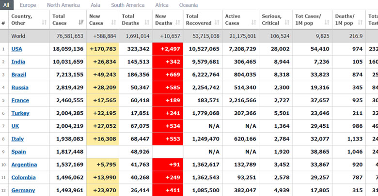 เว็บไชต์ Worldometers รายงานสถานการณ์ไวรัสโควิด-19 ประจำวันที่ 20 ธันวาคม 2563 ช่วงเวลาประมาณ 06.50 น. ตามเวลาประเทศไทย พบมีผู้ป่วยติดเชื้อทั่วโลกรวม 76,581,653 ราย เพิ่มขึ้น 588,884 ราย เสียชีวิต 1,691,014 ราย เพิ่มขึ้น 10,657 ราย รักษาหาย 53,715,038 ราย
