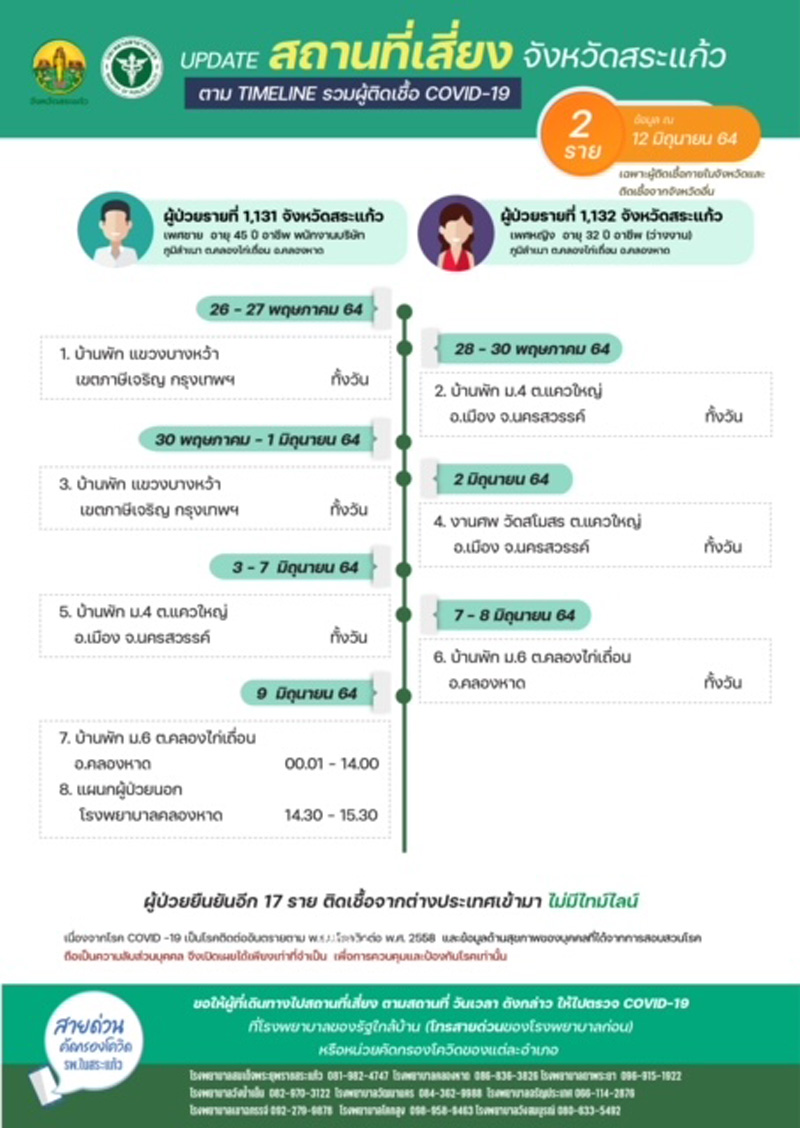 นายแพทย์สาธารณสุขจังหวัดสระแก้ว กล่าวว่า ข้อมูลผู้ป่วยยืนยันรายใหม่ 2 รายในวันนี้ เป็นสามี-ภรรยากันมีภูมิลำเนาอยู่ตำบลคลองไก่เถื่อน อำเภอคลองหาด แต่ทำงานอยู่ กทม. จากการสอบสวนโรคพบว่าทั้งคู่อยู่ กทม. ต่อมาเมื่อวันที่ 28-30 พฤษภาคม 2564 สามีเดินทางไปรับภรรยาที่ดูแลบิดาที่กำลังป่วยที่อำเภอเมือง จังหวัดนครสวรรค์ เพื่อมาฉีดวัคซีนไข้หวัดใหญ่ที่ กทม.