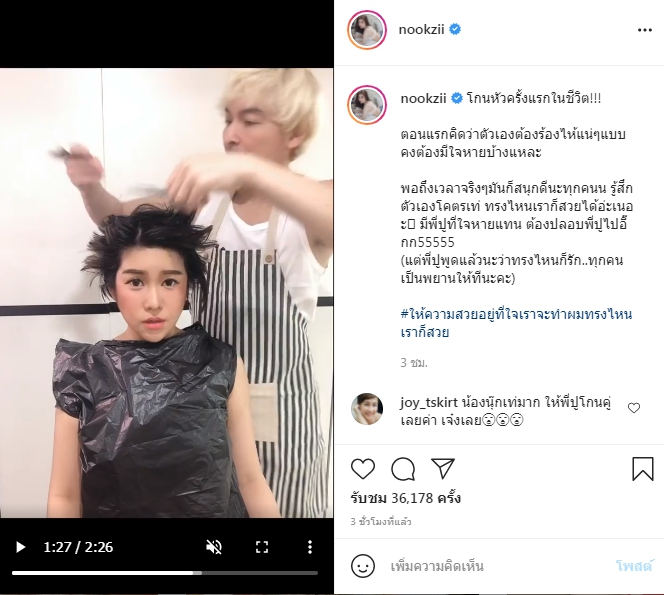 ล่าสุดสาวนุ๊กซี่ ได้โพสต์คลิปขณะกำลังให้ปู แบล็คเฮดโกนผมให้เธอ พร้อมกับลงอินสตาแกรมส่วนตัว และเขียนแคบชั่นว่า… “โกนหัวครั้งแรกในชีวิต !!! ตอนแรกคิดว่าตัวเองต้องร้องไห้แน่ๆ แบบคงต้องมีใจหายบ้างแหละ พอถึงเวลาจริงๆ มันก็สนุกดีนะทุกคนน รู้สึกตัวเองโคตรเท่ ทรงไหนเราก็สวยได้อ่ะเนอะ มีพี่ปูที่ใจหายแทน ต้องปลอบพี่ปูไปอี๊กก 55555 (แต่พี่ปูพูดแล้วนะว่าทรงไหนก็รัก..ทุกคนเป็นพยานให้ทีนะคะ) #ให้ความสวยอยู่ที่ใจเราจะทำผมทรงไหนเราก็สวย”