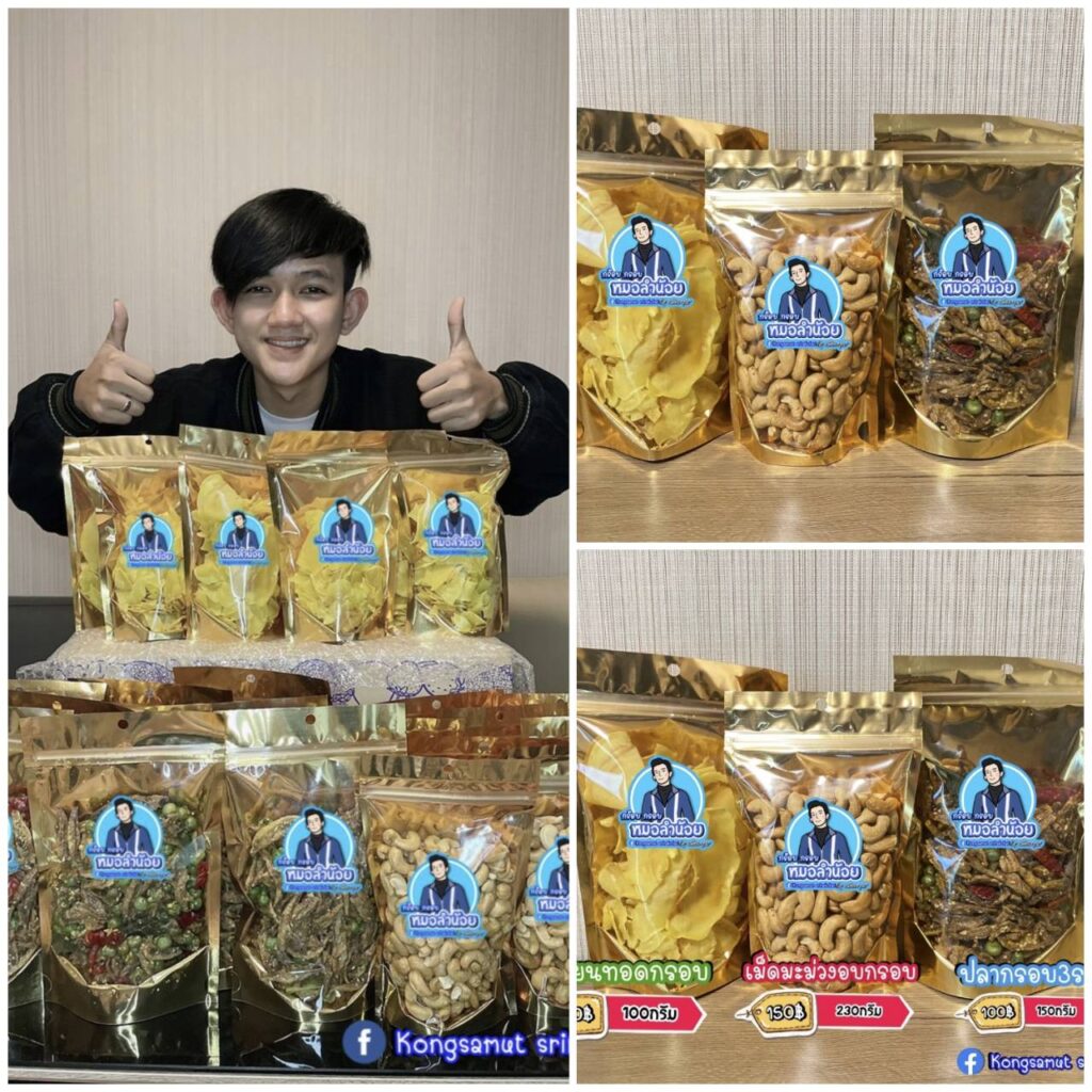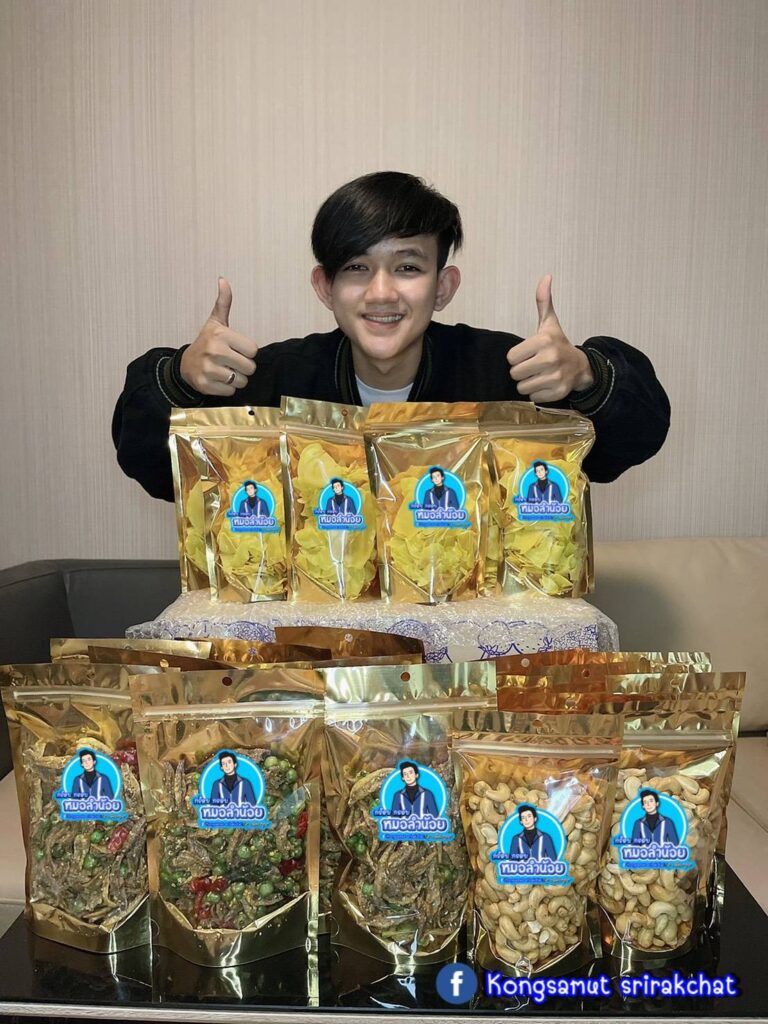 “ตอนนี้อยู่ว่างๆผมก็ขายของครับ มีทุเรียนทอดกรอบ 100 กรัม 150 บาท เม็ดมะม่วงอบกรอบ 230 กรัม 150 บาท และปลากรอบสามรส 150กรัม 100 บาทครับ ของเราจะครบรส เค็ม มันส์ หวาน กรอบ อร่อย เรียกได้ว่าครบ อร่อยแน่นอนครับ เพราะผมก็เลือกสิ่งดีๆมาให้ทุกคน เริ่มจากสถานการณ์โควิด พี่ๆในค่ายก็มีขายสินค้าเป็นรายได้เสริมกัน เราก็เลยนำมาขายบ้างเพราะอยากหารายได้เสริมเหมือนกันครับ กระแสตอบรับจากแม่ๆแฟนคลับและทุกคนดีครับ ออเดอร์มาเรื่อยๆต้องขอบคุณมากๆนะครับ เดี๋ยวจะทำโลโก้เพิ่มครับใช้แบรนด์เป็นของตัวเองชื่อว่า “หมอลำน้อย” ครับ ตอนนี้ผมก็มีเรียนออนไลน์ และก็เอาของมาขายนี่แหละครับ ฝากอุดหนุนกันได้นะครับที่ FB : Kongsamut Sririkchat ขอบคุณมากครับ”