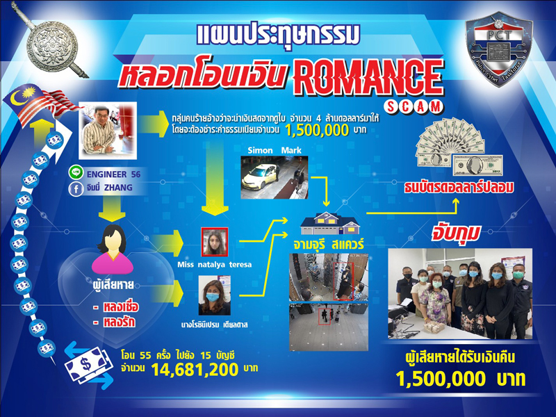 สำหรับในวันนี้เป็นการแถลงผลการจับกุมคดีสำคัญที่มีผู้เสียหายจำนวนมาก 4 คดี อาทิ จับกุมผู้ต้องหา Romance Scam และเงินดำ, คดีแชร์ออนไลน์บ้านปีใหม่ฐานฉ้อโกงประชาชน, จับกุมผู้ต้องหาแอบอ้างใช้รูปดาราไปสร้างโปรไฟล์ในทวิตเตอร์เพื่อการ ค้าประเวณี และจับกุมพนันออนไลน์ ฟุตบอลยูโร 2020 โดยควบคุมตัว นายธนวิชญ์ (สงวนนามสกุล) ยึดของกลาง รถยนต์หรู คอมพิวเตอร์โน๊ตบุ๊ค และสมุดบัญชีธนาคาร 5 เล่ม ซิมการ์ด 194 ชิ้น บัตร ATM 14 ใบ ยอดเงินหมุนเวียนในบัญชีประมาณ 50 ล้านบาทต่อเดือน โดยทรัพย์สินที่ตรวจพบทั้งหมดจะทำรายงาน ปปง. มีคำสั่งยึดและอายัดตามกฎหมายฟอกเงินต่อไป