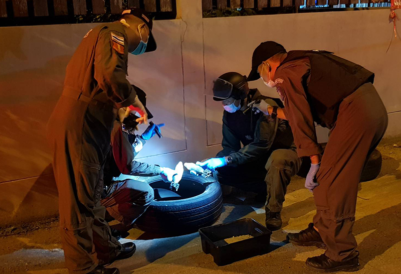โดยที่เกิดเหตุเข้ามาในซอยประมาณ 20 เมตร พบวัตถุคล้ายระเบิดลักษณะหัวปลี 2 ลูก วางอยู่ข้างกำแพงแคมป์พักคนงาน จากการตรวจสอบเบื้องต้นพบว่า วัตถุดังกล่าวเป็น ระเบิด ค.60 รัศมีทำลายประมาณ 25 เมตร เจ้าหน้าที่จึงนำยางรถยนต์มาครอบไว้ และทำการปิดกั้นพื้นที่เพื่อความปลอดภัย