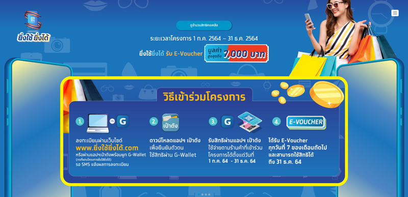 โครงการยิ่งใช้ยิ่งได้ กำหนดให้ประชาชนผู้ได้รับสิทธิที่ชำระเงินค่าสินค้าหรือบริการ ได้แก่ ค่าอาหาร เครื่องดื่ม สินค้าทั่วไป ค่าบริการนวด สปา ทำผมทำเล็บ (ไม่รวมถึงสลากกินแบ่ง เครื่องดื่มแอลกอฮอล์ ยาสูบบัตรกำนัล (gift voucher) บัตรเงินสด (gift card) และสินค้าหรือบริการที่เป็นการชำระค่าสินค้าหรือบริการล่วงหน้า)ผ่านกระเป๋าเงินอิเล็กทรอนิกส์โดยภาครัฐ (g-Wallet) บนแอปพลิเคชัน “เป๋าตัง” ระหว่างวันที่ 1 กรกฎาคม – 30 กันยายน 2564 กับผู้ประกอบการจดทะเบียนภาษีมูลค่าเพิ่มที่ติดตั้งแอปพลิเคชัน “ถุงเงิน” ที่เข้าร่วมโครงการจะได้รับวงเงินสนับสนุนในรูปของบัตรกำนัลอิเล็กทรอนิกส์ (e-Voucher) โดยวงเงินใช้จ่ายที่จะนำมาคำนวณสิทธิ e-Voucher ไม่เกิน 60,000 บาทต่อคน ซึ่งยอดใช้จ่ายที่นำมาคำนวณสิทธิต้องไม่เกิน 5,000 บาทต่อคนต่อวัน และจะได้รับสิทธิ e- Voucher สะสมสูงสุดไม่เกิน 7,000 บาทต่อคน ตลอดระยะเวลาโครงการ โดยยอดใช้จ่ายจริงตั้งแต่ 1-40,000 บาทแรก ได้รับ e-Voucher ร้อยละ 10 ของยอดใช้จ่าย แต่ไม่เกิน 4,000 บาทต่อคน และยอดใช้จ่ายจริงตั้งแต่ 40,001-60,000 บาท ได้รับ e-Voucher ร้อยละ 15 ของยอดใช้จ่าย แต่ไม่เกิน 3,000 บาทต่อคน ซึ่งสิทธิ e-Voucher จะคืนเป็นวงเงินใน g-Wallet ทุกต้นเดือนถัดไป โดยสามารถใช้จ่ายด้วย e -Voucher ได้ตั้งแต่เดือนสิงหาคมถึงวันที่ 31 ธันวาคม 2564 และไม่สามารถแลกเป็นเงินสดได้