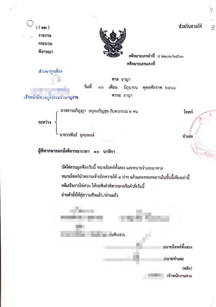 ข้อความหมิ่นประมาทดังกล่าว “เป็นการโพสต์ภาพสินค้าซึ่งถ่ายจากบุคคลอื่นโดยไม่ได้รับอนุญาตและเขียนข้อความเป็นเท็จทำให้ได้รับความเสียหาย” การประทับรับฟ้องครั้งนี้เนื่องจากคดีมีมูลความผิด โดยได้รับความเมตตาจากศาลที่ไต่สวนอย่างเป็นธรรมจึงมีคำสั่งในวันนี้ โดยหลังไต่สวนเสร็จได้ดำเนินการเพื่อนำส่งหมายเรียกตามคำสั่งศาลแล้ว