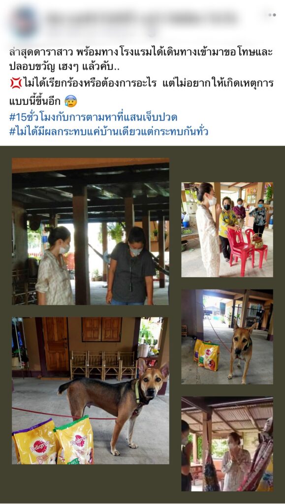 ล่าสุดเจ้าของน้องหมาได้โพสต์ภาพของสาวดิว พร้อมข้อความระบุว่า “ล่าสุดดาราสาว พร้อมทางโรงแรมได้เดินทางเข้ามาขอโทษและปลอบขวัญ เฮงๆ แล้วคับ..ไม่ได้เรียกร้องหรือต้องการอะไร แต่ไม่อยากให้เกิดเหตุการแบบนี้ขึ้นอีก #15ชั่วโมงกับการตามหาที่แสนเจ็บปวด #ไม่ได้มีผลกระทบแค่บ้านเดียวแต่กระทบกันทั่ว”