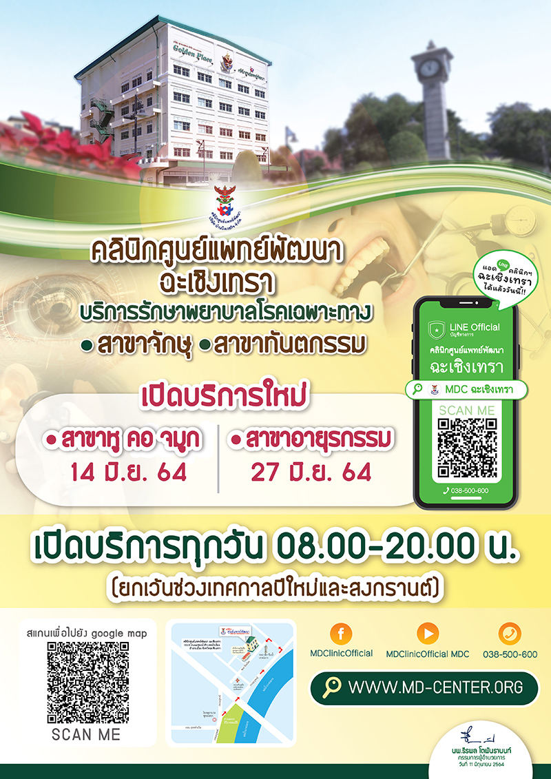 คลินิกศูนย์แพทย์พัฒนา จังหวัดฉะเชิงเทรา รักษาพยาบาลโรคเฉพาะทาง สาขาจักษุและสาขาทันตกรรม เปิดให้บริการใหม่สาขาหู คอ จมูก ตั้งแต่วันที่ ๑๔ มิ.ย. ๖๔ และสาขาอายุรกรรม ตั้งแต่วันที่ ๒๗ มิ.ย. ๖๔ บริการตรวจวินิจฉัย ให้คำปรึกษา การรักษาและผ่าตัดเล็ก พร้อมด้วยการนำเทคโนโลยีทางการแพทย์มาช่วยในการรักษาและตรวจวินิจฉัยอย่างมีคุณภาพ รวมถึงส่งเสริมสุขภาพผู้ป่วยนอกโรคทางอายุรกรรม ทุกวัน ไม่เว้นวันหยุดเสาร์ – อาทิตย์ ตั้งแต่เวลา ๐๘.๐๐ – ๒๐.๐๐ น. สอบถามข้อมูลเพิ่มเติม www.md-center.org โทร. ๐-๓๘๕๐-๐๖๐๐