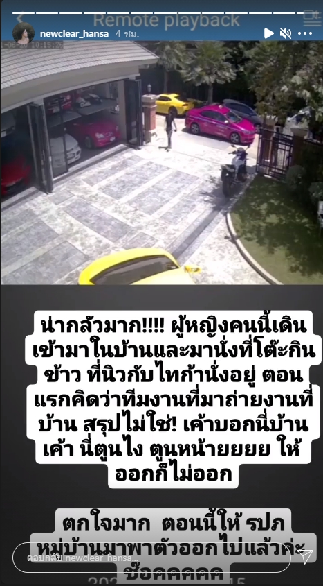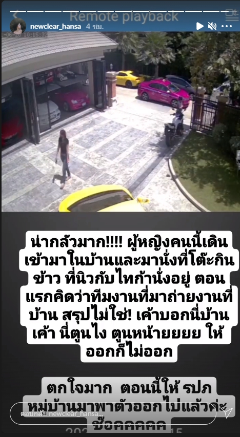 “น่ากลัวมาก ผู้หญิงคนนี้เดินเข้ามาในบ้านและมานั่งที่โต๊ะกินข้าว ที่นิวกับไทก้านั่งอยู่ ตอนแรกคิดว่าทีมงานที่มาถ่ายงานที่บ้าน สรุปไม่ใช่! เขาบอกนี่บ้านเขา นี่ตูนไง ตูนไหน ให้ออกก็ไม่ออก ตกใจมาก ตอนนี้ให้ รปภ.หมู่บ้าน มาพาตัวออกไปแล้วค่ะ ช็อกกกก”