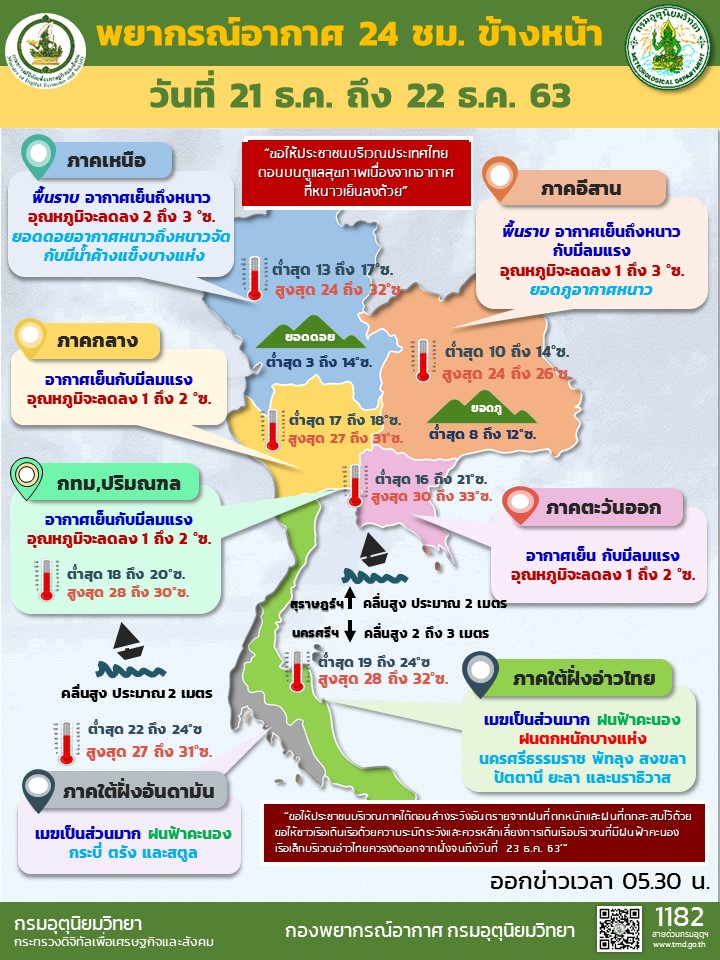 กรมอุตุนิยมวิทยา รายงาน พยากรณ์อากาศ 24 ชั่วโมงข้างหน้า บริเวณความกดอากาศสูงหรือมวลอากาศเย็นกำลังค่อนข้างแรงอีกระลอกจากประเทศจีนได้แผ่ลงมาปกคลุม ถึงประเทศไทยตอนบนแล้ว ลักษณะเช่นนี้จะทำให้ประเทศไทยตอนบนมีอุณหภูมิลดลงอีก 1-3 องศาเซลเซียส และมีอากาศเย็นถึงหนาวกับมีลมแรง ส่วนบริเวณยอดดอยและยอดภูมีอากาศหนาวถึงหนาวจัด ขอให้ประชาชนบริเวณประเทศไทยตอนบนดูแลสุขภาพเนื่องจากอากาศที่หนาวเย็นลงด้วย สำหรับมรสุมตะวันออกเฉียงเหนือที่พัดปกคลุมอ่าวไทยและภาคใต้มีกำลังแรง ทำให้ภาคใต้ตอนล่างยังคงมีฝนตกหนักบางแห่ง ขอให้ประชาชนบริเวณดังกล่าวระวังอันตรายจากฝนตกหนักและฝนตกสะสมไว้ด้วย ส่วนคลื่นลมบริเวณอ่าวไทยมีกำลังแรง โดยอ่าวไทยตอนบนมีคลื่นสูงประมาณ 2 เมตร ส่วนอ่าวไทยตอนล่างคลื่นสูง 2-3 เมตร บริเวณที่มีฝนฟ้าคะนองคลื่นสูงมากกว่า 3 เมตร ขอให้ชาวเรือเดินเรือด้วยความระมัดระวังและควรหลีกเลี่ยงการเดินเรือบริเวณที่มีฝนฟ้าคะนองเรือเล็กบริเวณอ่าวไทยควรงดออกจากฝั่งจนถึงวันที่ 23 ธ.ค. 63 อนึ่งพายุโซนร้อน “กรอวาญ” (พายุระดับ 3) บริเวณทะเลจีนใต้ตอนกลาง กำลังเคลื่อนตัวทางทิศตะวันตกเฉียงใต้ คาดว่าจะอ่อนกำลังลง ในช่วงวันที่ 23-24 ธ.ค. 63 ฝุ่นละอองขนาดเล็ก ลมที่พัดปกคลุมประเทศไทยตอนบนมีกำลังแรงขึ้น ทำให้การสะสมของฝุ่นละออง/หมอกควันลดลงในระยะนี้ ขณะที่ กรุงเทพมหานครและปริมณฑล อากาศเย็นกับมีลมแรง และอุณหภูมิจะลดลง 1-2 องศาเซลเซียส อุณหภูมิต่ำสุด 18-20 องศาเซลเซียส อุณหภูมิสูงสุด 28-30 องศาเซลเซียส ลมตะวันออกเฉียงเหนือ ความเร็ว 10-30 กม./ชม.