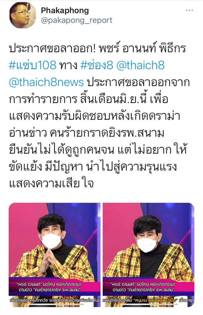 ล่าสุดทาง พชร์ อานนท์ ได้ออกมาขอโทษกับเรื่องที่เกิดขึ้น พร้อมประกาศขอลาออกจากการการทำหน้าที่พิธีกรรายการ แซ่บ 108 ในสิ้นเดือนมิถุนายนนี้ เพื่อแสดงความรับผิดชอบต่อเรื่องที่เกิดขึ้น ยืนยันไม่ได้ดูถูกคนจน แต่ไม่ต้องการให้เกิดความขัดแย้ง หรือมีปัญหา และนำไปสู่ความรุนแรง