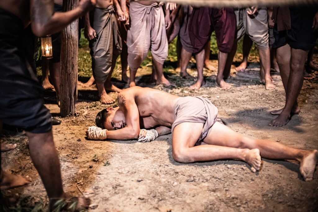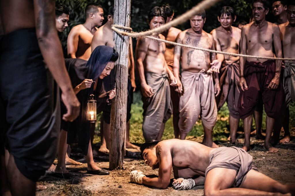 โดยฉากนี้ มาก (นิว ชัยพล) ผู้ซึ่งมีฝีมือเชิงมวยที่จัดจ้าน และชอบที่จะลงสนามประลองกำลังเพื่อชิงเงินเดิมพัน ได้แวะมาที่ลานประลองมวยคาดเชือก เพื่อดูการต่อสู้ของคู่สำคัญระหว่างแจ้กับไอ้สิงห์ บ้านท่าโพ ซึ่งในเวลาไม่นานแจ้ก็โดนน็อก ทำให้ มั่น (บอส โตนนท์) หงุดหงิดที่เห็นคนของตัวเองแพ้ แต่พอเห็นมากเสนอตัวเป็นคู่ชกกับไอ้สิงห์ เลยออกอุบายว่าถ้า สิงห์คว่ำมาก ได้จะแถมเงินให้อีกสิบชั่ง