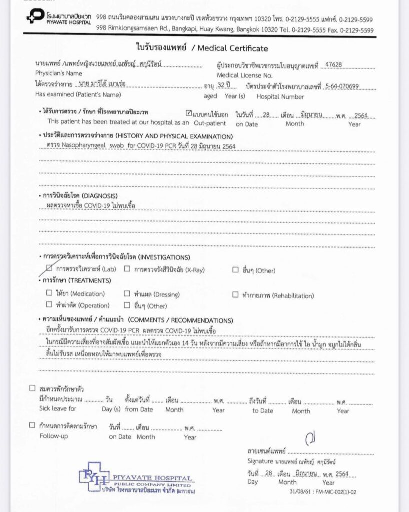 ล่าสุดหนุ่มมาริโอ้ ได้ดพสต์โชว์ผลตรวจหาเชื้อโควิด-19 ผ่านอินสตาแกรมส่วนตัว เพื่อแจ้งข่าวกับแฟนๆ ว่าผลตรวจของตน เป็นลบ ไม่พบเชื้อโควิด-19 และขอบคุณทุกคนที่เป็นห่วง