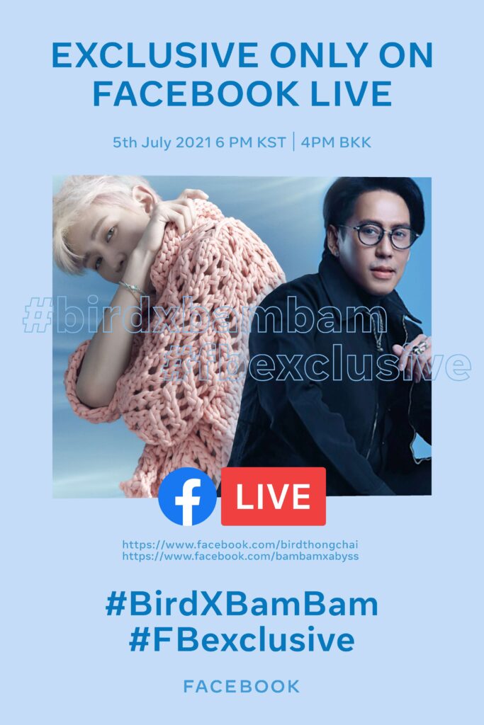 โดยงาน Facebook Live ครั้งนี้ จะเป็นครั้งแรกที่ศิลปินระดับซุปตาร์ทั้งสองได้ร่วมมือกัน โดยทั้งคู่จะร่วมพูดคุยถึงผลงานที่ผ่านมา อุตสาหกรรมดนตรีของทั้งประเทศไทยและเกาหลี รวมทั้งเส้นทางการเป็นศิลปินเดี่ยว โดยทั้งพี่เบิร์ดและแบมแบมจะมาแบ่งปันเรื่องราวเหล่านี้ในช่วงเวลาสุดพิเศษกับแฟนๆ ทางออนไลน์