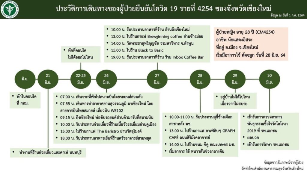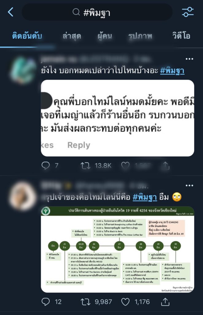 และไทม์ไลน์ที่สาธารณสุข เชียงใหม่ได้ชี้แจงถึงผู้ป่วยโควิดรายที่ 4254 ทำอาชีพ “นักแสดงอิสระ” ได้เดินทางถึงจังหวัดเชียงใหม่วันที่ 26 มิ.ย. และตรวจพบเชื้อในวันที่ 30 มิ.ย. แต่ระหว่างนั้นเจ้าตัวก็ได้เดินทางไปสถานที่ต่างๆ ตามไทม์ไลน์ที่แจ้งไป ก็กลายเป็นคำถามว่า “ทำไมไม่กักตัว 14 วัน ตามมาตรการของจังหวัด” และยังคงเดินทางไปตามสถานที่ต่างๆ จนส่งผลให้ร้านค้า คาเฟ่ ที่สาวพิมฐา เดินทางไปได้รับผลกระทบ รวมถึงบุคคลที่อยู่ในช่วงเวลาที่พิมฐาได้แจ้งไทม์ไลน์ไปด้วย เรียกว่าได้รับผลกระทบทุกฝ่าย จนกลายเป็นที่วิพากษ์วิจารณ์ของชาวเน็ต พร้อมถามหาความรับผิดชอบจากเน็ตไอดอลสาว เรียกว่าทวิตเตอร์ลุกเป็นไฟในตอนนี้