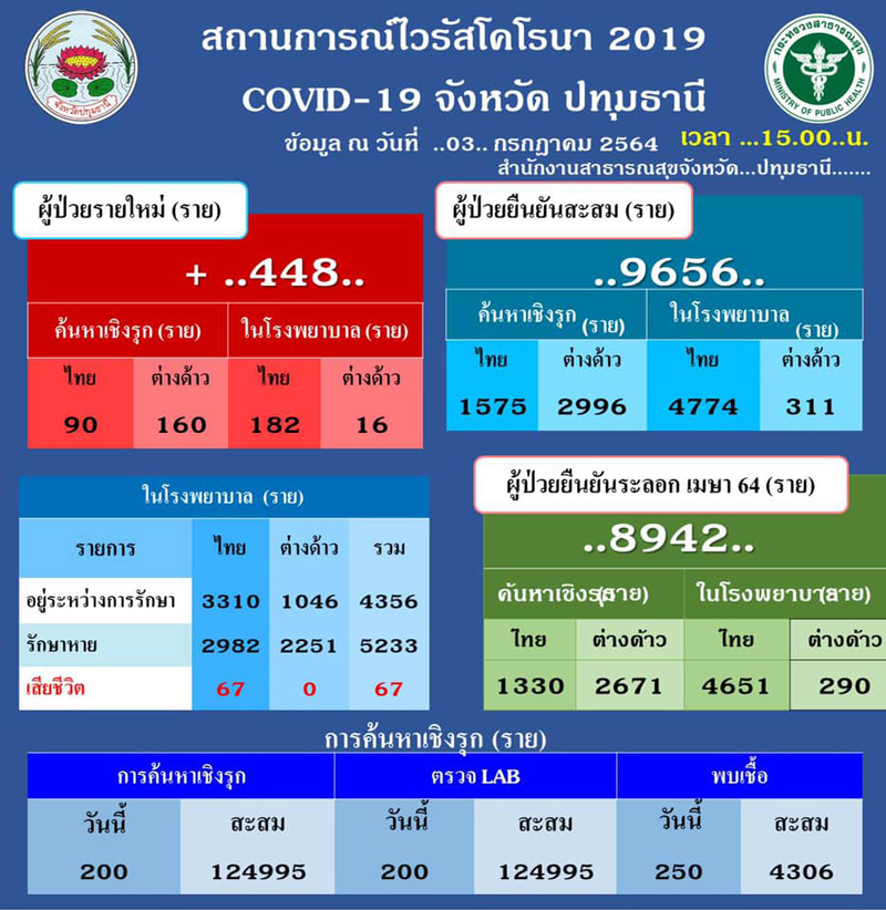จากสถิติผู้ติดเชื้อโควิด-19 ในจังหวัดปทุมธานีวันนี้ มีผู้ติดเชื้อรายใหม่ จำนวน 448 ราย มีผู้ป่วยสะสม 9,656 ราย รักษาหายแล้วกลับบ้านจำนวน 5,233 ราย อยู่ระหว่างการดูแลรักษาจำนวน 4,356 ราย และมีผู้เสียชีวิตสะสมจำนวน 67 ราย