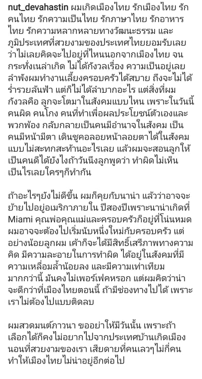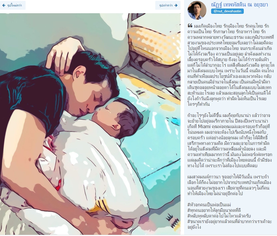กลายเป็นประเด็นร้อนที่ชาวเน็ตให้ความสนใจ หลังจาก นักแสดงหนุ่ม “ณัฏฐ์ เทพหัสดิน ณ อยุธยา”ได้ออกมาโพสต์ภาพพร้อมกับเขียนข้อความร่ายยาวในอินสตาแกรมส่วนตัว ในทำนองตัดพ้อสังคมเมืองไทย กลัวลูกโตมาในสังคม ที่คนผิด คนโกงกลายเป็นคนมีอำนาจ เดินชูคอลอยหน้าลอยตาไม่สะทกสะท้าน แล้วจะสอนลูกให้เป็นคนดีได้ยังไง ลั่นหากสังคมไม่ดีขึ้นเตรียมพาลูกเมียย้ายไปอยู่ที่อเมริกา ถึงแม้ว่าจะรักประเทศไทยมากก็ตาม