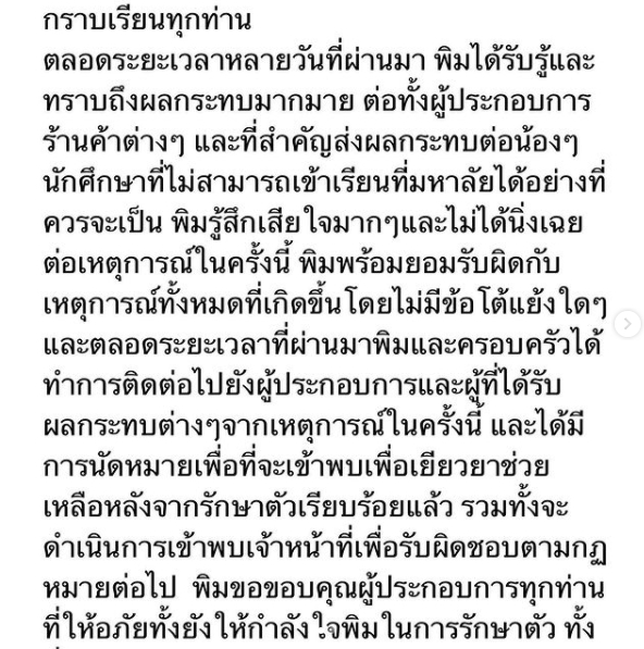 “กราบเรียนทุกท่าน ตลอดระยะเวลาหลายวันที่ผ่านมา พิมได้รับรู้และทราบถึงผลกระทบมากมาย ต่อทั้งผู้ประกอบการร้านค้าต่างๆและที่สำคัญส่งผลกระทบต่อน้องๆนักศึกษาที่ไม่สามารถเข้าเรียนที่มหาลัยได้อย่างที่ควรจะเป็น พิมรู้สึกเสียใจมากๆและไม่ได้นิ่งเฉยต่อเหตุการณ์ในครั้งนี้ พิมพร้อมยอมรับผิดกับเหตุการณ์ทั้งหมดที่เกิดขึ้นโดยไม่มีข้อโต้แย้งใดๆและตลอดระยะเวลาที่ผ่านมาพิมและครอบครัวได้ทำการติดต่อไปยังผู้ประกบการและผู้ที่ได้รับผลกระทบต่างๆ จากเหตุการณ์ในครั้งนี้ และได้มีการนัดหมายเพื่อที่จะเข้าพบเพื่อเยียวยาช่วยเหลือหลังจากรักษาตัวเรียบร้อยแล้ว รวมทั้งจะดำเนินการเข้าพบเจ้าหน้าที่เพื่อรับผิดชอบตามกฎหมายต่อไป พิมขอขอบคุณผู้ประกอบการทุกท่านที่ให้อภัย ทั้งยังให้กำลังใจพิมในการรักษาตัว”