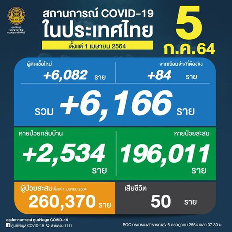มีผู้ติดเชื้อรายใหม่ 6,166 ราย โดยแบ่งเป็นผู้ติดเชื้อทั่วไป 6,082 ราย และ ผู้ติดเชื้อภายในเรือนจำ 84 ราย ทำให้มีผู้ป่วยสะสม 289,233 ราย (สะสมเฉพาะตั้งแต่ 1 เม.ย. ที่ผ่านมา 260,370 ราย) และมีผู้เสียชีวิตเพิ่มอีก 50 ราย รวมมีผู้เสียชีวิตจากโควิด 19 แล้ว จำนวน 2,276 ราย
