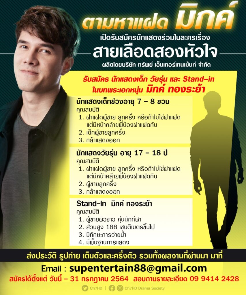 ล่าสุดค่ายทรัพย์ เอ็นเทอร์เทนเม้นท์ เตรียมงานละครเรื่องใหม่เต็มที่ พร้อมผุดโปรเจ็กต์พิเศษ “ตามหาแฝด มิกค์” เพื่อมารับบทฝาแฝดของพระเอกหนุ่ม มิกค์ ทองระย้า ในละคร โดยเปิดรับสมัครทั้งนักแสดงเด็ก และวัยรุ่น รวมทั้งหา สแตนด์อินมิกค์ในละครด้วย