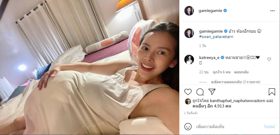 ทำเอาเพื่อนพ้อง น้องพี่ ในวงการ รวมถึงแฟนคลับเข้ามาโพสต์แสดงความยินดีอย่างล้นหลาม หลังจาก เกม ดวงพร ภรรยาสาวสวยของนักร้องหนุ่ม มอส ปฏิภาณ ปฐวิกานต์ ออกมาโพสต์อินสตาแกรมอวดภาพท้องโต พร้อมแคปชั่นว่า “อ้าว ท้องอีกรอบ” จนหลายคนคิดว่า หนุ่มมอสน้ำยาดีทำให้ภรรยาสาวตั้งท้องลูกคนที่สามอีกคน แต่ก่อนที่ทุกคนจะคิดไปไกลกว่านี้ สาวเกมเลยติดแฮชแท็กชื่อลูกสาวคนเล็ก #swan_patavekarn พร้อมเฉลยสาเหตุที่ทำให้ท้องอีกรอบเพราะความทะเล้นของน้องสวรรค์ที่มุดเข้าไปอยู่ในชุดนอนแม่ จนทำให้ดูท้องป่องนั้นเอง