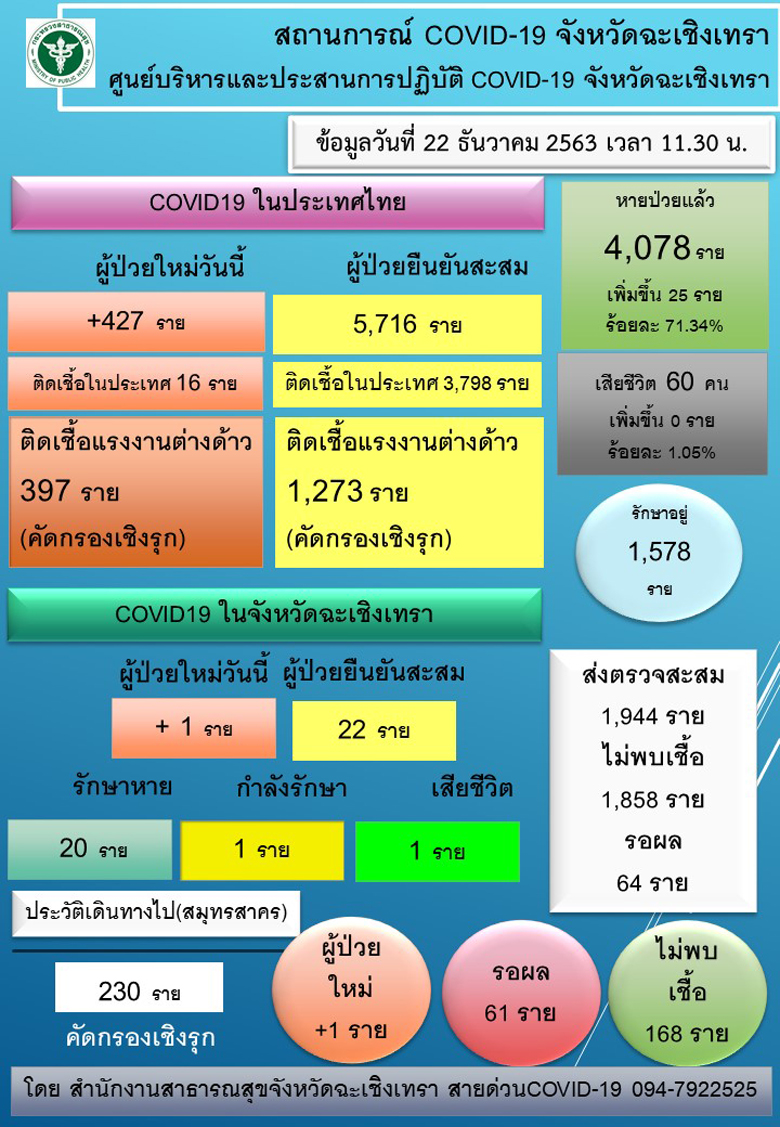 ผู้สื่อข่าวได้รับการเปิดเผยข้อมูลจากศูนย์ปฏิบัติการโควิด-19 จ.ฉะเชิงเทรา ถึงไทม์ไลน์ของหญิงสาววัย 24 ปี ที่เพิ่งตรวจพบเชื้อโควิด-19 เป็นรายแรกและถือเป็นรายที่ 22 ของ จ.ฉะเชิงเทรา โดยมีไทม์ไลน์เริ่มต้นดังนี้ – วันที่ 13 ธ.ค.63 ได้เดินทางไปส่งกุ้งยังที่แพกุ้งมหาชัย – วันที่ 14-16 ธ.ค.63 มาทำงานที่บริษัทภายในนิคมอุตสาหกรรมย่าน กม.35 ซ.5 ริมถนนเทพรัตน (บางนา-ตราด) ช่วงเย็นเดินทางไปรับประทานอาหารที่ตลาดบางวัว และที่ ต.ท่าสะอ้าน อ.บางปะกง จ.ฉะเชิงเทรา – วันที่ 17 ธ.ค.63 ลาหยุดงานและเดินทางไปรับประทานก๋วยเตี๋ยวที่ร้านดู๋ดี๋ ช่วงเวลา 08.30-09.00 น. ที่ย่านตลาดบางวัว เวลา 09.00-09.30 น. แวะซื้อของที่โลตัสเอ็กซ์เพลสที่ตลาดบางวัว และแวะซื้อยาจากร้านขายยาไม่ทราบชื่อบริเวณสะพานบางวัว – วันที่ 18 ธ.ค.63 ช่วงเช้าเดินทางไปทำงานที่บริษัทย่าน ซ.5 เริ่มป่วยมีอาการเจ็บคอน้ำมูกไหล หัวหน้างานให้ลากลับบ้าน เมื่อเวลา 09.00 น. แวะซื้อก๋วยเตี๋ยวไปรับประทานก่อนกลับบ้าน ที่บริเวณปากทางเข้า ต.หอมศีล อ.บางปะกง – วันที่ 19 ธ.ค.63 เดินทางไปยังบ้านแฟนที่ อ.บางบ่อ จ.สมุทรปราการ พื้นที่ติดกัน เวลา 18.00-19.00 น. พากันไปรับประทานอาหารยังที่ร้านนาริ บุฟเฟต์ ใน จ.ชลบุรี – วันที่ 20 ธ.ค.63 เวลา 09.00-10.00 น. เดินทางไปเลือกตั้งนายก และ ส.อบจ. ที่หน่วยเลือกตั้งท้ายตลาดบางพลีน้อย อ.บางบ่อ จ.สมุทรปราการ จากนั้นไปเข้ารับการตรวจหาเชื้อโควิด-19 ที่ รพ.จุฬารัตน์ 11 ต.บางวัว อ.บางปะกง จ.ฉะเชิงเทรา จากนั้นเดินทางไปยังบ้านแฟนยังที่ อ.บางบ่อ จ.สมุทรปราการ และแวะเข้าไปซื้อของในร้าน 7-11 ที่ปั้ม ปตท.ริมถนนบางนา-ตราด กม.34 ย่านบางพลีน้อย อ.บางบ่อ จ.สมุทรปราการ – วันที่ 21 ธ.ค.63 พาผู้เป็นบิดาเดินทางมาตรวจหาเชื้อโควิด-19 ที่ รพ.บางปะกง ก่อนที่ทาง รพ.จุฬารัตน์ 11 จะแจ้งผลการตรวจให้ทราบว่าพบเชื้อโควิด-19 ให้ผลเป็นบวก และเข้ารับการรักษายังใน รพ.บางปะกง จ.ฉะเชิงเทรา โดยที่มีผู้สัมผัสใกล้ชิดอยู่ในข่ายความเสี่ยงสูง 14 ราย ผู้สัมผัสความเสี่ยงต่ำ 14 ราย ซึ่งผู้ป่วยรายนี้มีประวัติมักจะแวะที่ตลาดบูรพา และตลาดบางวัว ใน อ.บางปะกง ทุกๆ เย็น หลังจากเลิกงาน