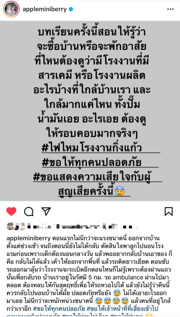 “ไม่ได้รับความเสียหายเลย แต่เราอยู่ในรัศมีภายใน 5 กิโลเมตร ตามที่เขากำหนด และประกาศจากทางการ และนิติบุคคลให้อพยพเราเลยตัดสินใจออกมาครับ เพราะถึงแม้เราจะไม่ได้รับผลกระทบ แต่ก็ยังคงมีสารเคมีต่างๆจากโรงงาน ที่เราต้องระวังในรัศมีนี้ เลยตัดสินใจออกมานอนที่โรงแรมครับ”