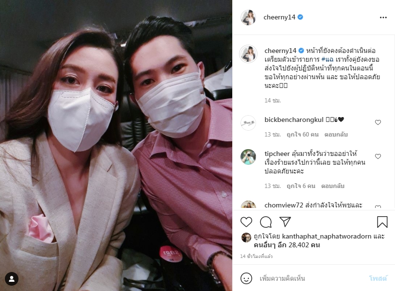 โดยสาวสเชียร์ ได้โพสต์ภาพคู่ไฮโซบิ๊ก พร้อมส่งกำลังใจผ่านอินสตาแกรมส่วนตัวให้ทุกคนว่า “เตรียมตัวเข้ารายการ#แฉ เราทั้งคู่ยังคงขอส่งใจไปยังผู้ปฏิบัติหน้าที่ทุกคนในตอนนี้ ขอให้ทุกอย่างผ่านพ้น และ ขอให้ปลอดภัยนะคะ”