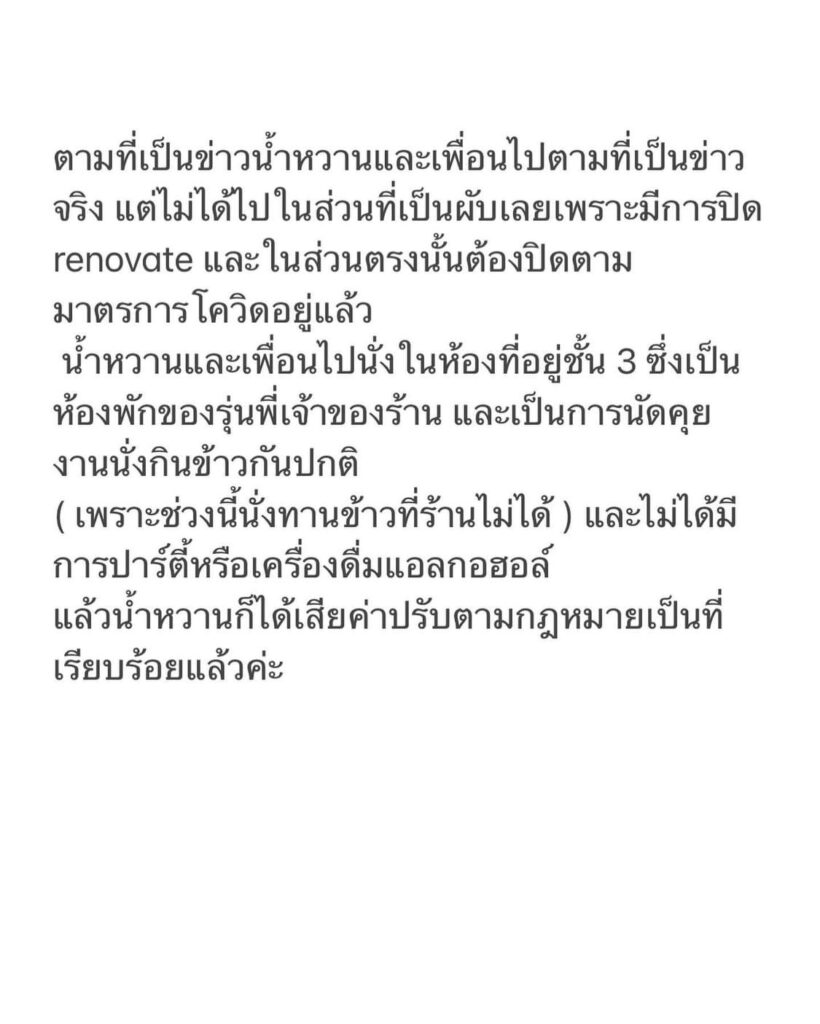 “น้ำหวานกับเพื่อนไปที่สถานที่ดังกล่าว ตามที่เป็นข่าวจริง แต่ไม่ได้ไปในส่วนที่เป็นผับเลยเพราะมีการปิดรีโนเวต และในส่วนตรงนั้นต้องปิดตามมาตรการอยู่แล้ว น้ำหวานและเพื่อนไปนั่งในห้องที่อยู่ชั้น 3 ซึ่งเป็นห้องปกติทั่วไป และเป็นการนัดคุยงานกัน ไม่ได้มีการปาร์ตี้และมีแต่เพื่อนๆ กัน สำหรับโทษที่ได้รับ มีเพียงการเสียค่าปรับเท่านั้น ไม่มีโทษจำคุกตามที่มีกระแสข่าวออกมาแต่อย่างใด”