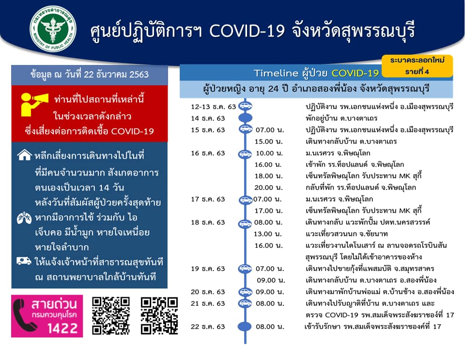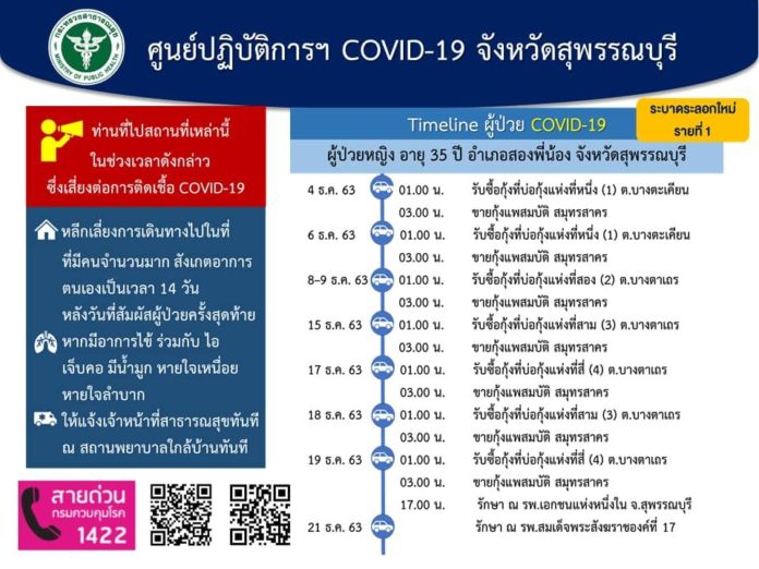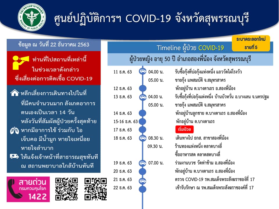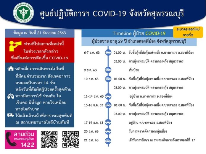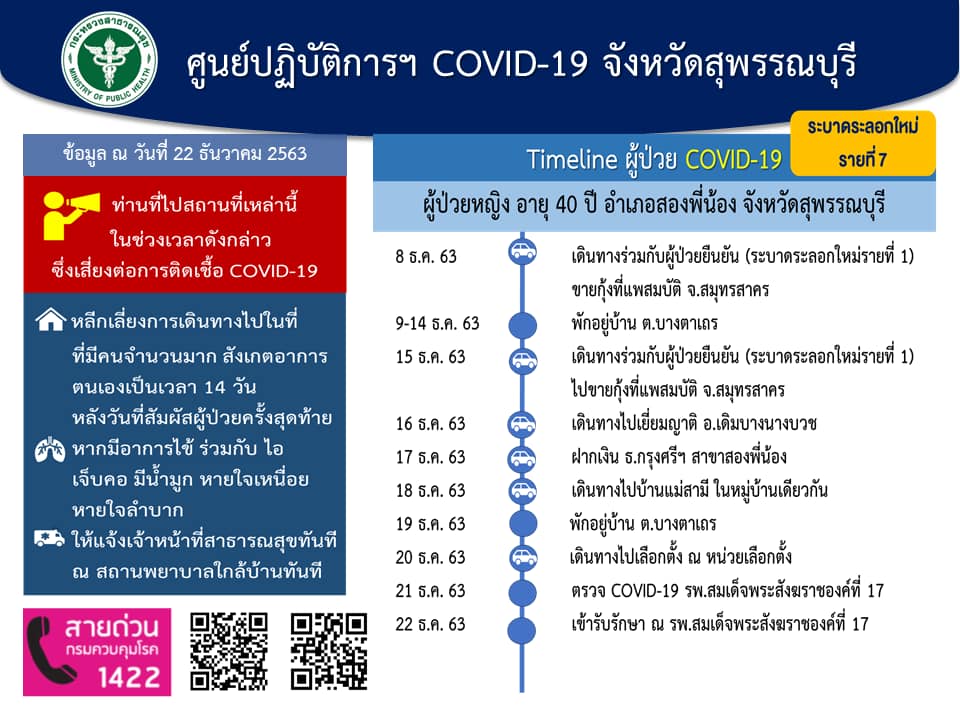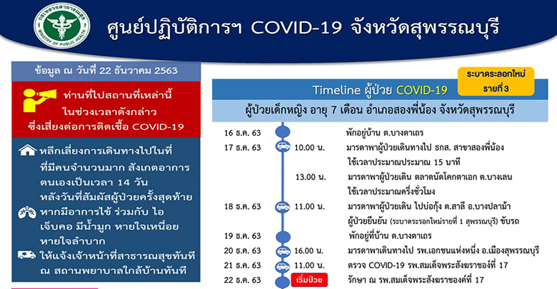 ผู้สื่อข่าวรายงานว่านายณัฐภัทร สุวรรณประทีบ ผู้ว่าราชการจังหวัดสุพรรณบุรี เปิดเผยว่า ขณะนี้ยอดผู้ป่วยระลอกใหม่ทั้งสิ้น 7 ราย และหนึ่งในนี้มีเด็กหญิง อายุ 7 เดือน เดินทางไปกับแม่ในพื้นที่ อ.สองพี่น้อง ผลตรวจยืนยันเด็กวัย 7 เดือน ติดเชื้อด้วย พบมีประวัติแม่พาไปธนาคาร-ตลาดนัด โดยศูนย์ปฏิบัติการฯ COVID-19 จ.สุพรรณบุรี แจ้งไทม์ไลน์ผู้ป่วยทั้ง 7 ราย ดังนี้ รายที่ 1 ผู้หญิง อายุ 35 ปี มีไทม์ไลน์ จากการไปค้าขายกุ้งที่ตลาดกลางกุ้ง จ.สมุทรสาคร รายที่ 2 ชายวัย 29 ปี ไปค้าขายกุ้งที่ตลาดกลางกุ้ง จ.สมุทรสาคร รายที่ 3 เป็นเด็กหญิง อายุ 7 เดือน พบประวัติแม่พาไปธนาคารและตลาด รวมทั้งไปบ่อกุ้ง อ.บางปลาม้า รายที่ 4 เป็นผู้หญิง อายุ 24 ทำงานอยู่ที่ รพ.เอกชนแห่งหนึ่ง ในจ.สุพรรณบุรี วันที่ 16 ธ.ค. พบประวัติเดินไปที่ จ.พิษณุโลก และไปเดินเซ็นทรัลพิษณุโลก วันที่ 18 ธ.ค. แวะพักที่ปั๊มน้ำมัน นครสวรรค์ และแวะเที่ยวที่สวนนก จ.ชัยนาท วันที่ 19 ธ.ค. ไปขายกุ้งที่สมุทรสาคร ก่อนกลับบ้านที่ สุพรรณบุรี รายที่ 5 ผู้หญิงอายุ 50 ปี เดินทางค้าขายกุ้งที่สมุทรสาคร และนครปฐม วันที่ 17 ธ.ค. เริ่มป่วย วันที่ 18 ธ.ค. เดินทางไปที่ ธนาคาร, ร้านทอง , ตลาดสด วันที่ 19 ธ.ค. ไปร่วมงานบวช วัดท่าขาม อ.สองพี่น้อง ก่อนเข้ารับการรักษาวันที่ 22 ธ.ค. ที่ผ่านมา รายที่6 เป็นชาย อายุ 31 ปี พบประวัติเดินทางค้าขายกุ้ง ที่ตลาดมหาชัย รายที่7 เป็นผู้หญิง อายุ 40 ปี พบประวัติสัมผัสใกล้ชิดกับผู้ป่วย และเดินทางไปที่แพกุ้ง จ.สมุทรสาคร