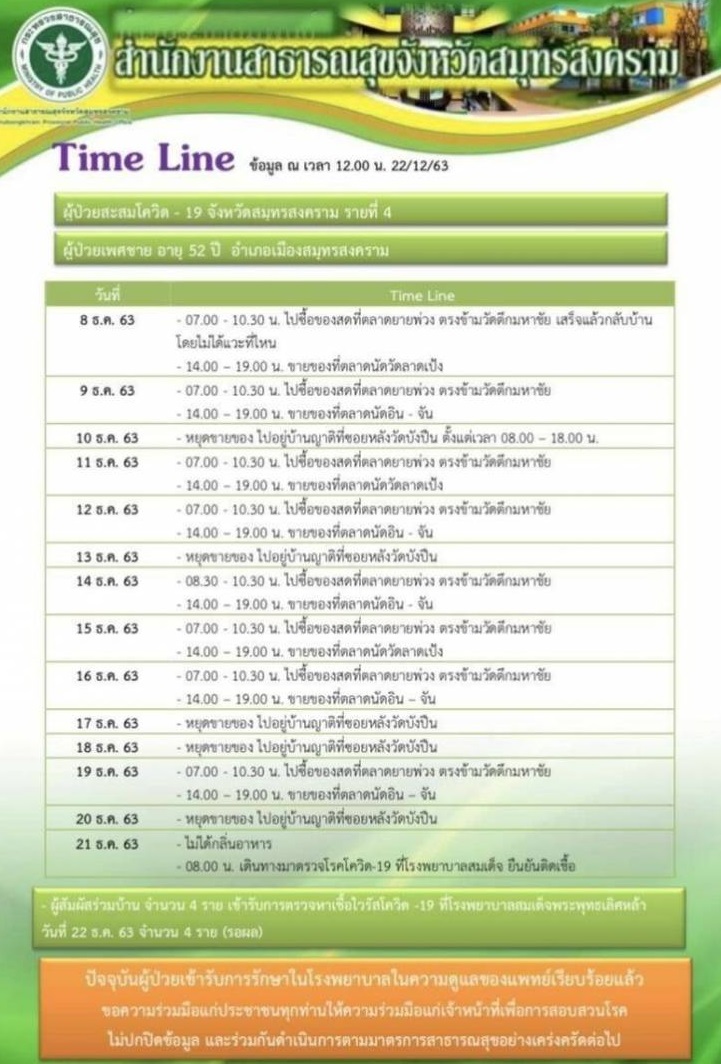 นายชรัส บุญณสะ ผู้ว่าราชการจังหวัดสมุทรสงคราม แถลงยืนยันผลตรวจหาเชื้อ COVID-19 ครั้งที่ 2 พบผู้ติดเชื้อ 6 คน รอผลอีก 2 คน ทั้งหมดเป็นคนไทย ได้แก่ -ผู้ป่วยหญิง อายุ 27 ปี อยู่ที่ อ.อัมพวา และทำงานที่ อบต.ดอนมะโนรา พบประวัติเดินห้างสรรพสินค้า The mall บางกะปิ, Central มหาชัย, ร่วมประชุมในโรงแรม, กินหมูกะทะที่ร้าน -ผู้ป่วยชายอายุ 46 ปี และหญิงอายุ 51 ปี สามีภรรยา อยู่ที่ อ.เมืองสมุทรสงคราม อาชีพรับส่งอาหารทะเลตลาดกุ้ง ต.มหาชัย พบประวัติเดินทางโดยรถยนต์รับกุ้งจากแพมหาชัย ช่วงเวลา 23.00-04.00 น. ของทุกวัน เพื่อขายตามบ้านและร้านอาหารใน จ.สมุทรสงคราม -ผู้ป่วยชาย อายุ 52 ปี อาชีพขายของที่ตลาดนัด อยู่ที่ อ.เมืองสมุทรสงคราม พบประวัติไปซื้อของสดที่ตลาดยายพ่วง -ผู้ป่วยหญิง อายุ 32 ปี อาชีพนักกายภาพ ทำงานที่ รพ.สมเด็จ เดินทางไปกลับบ้านที่ จ.สมุทรสาคร พบประวัติเดินทางกลับมหาชัยโดยรถตู้โดยสารประจำทาง, ไปเที่ยว จ.นครราชสีมา กับครอบครัว โดยแวะสถานที่ท่องเที่ยวสำคัญ เช่น วัดหลวงพ่อคูณ วัดศาลาลอย ไหว้ย่าโม, กินหมูกะทะที่ร้าน, เดินทางไปเลือกตั้งที่กาชาดจังหวัดสมุทรสาคร โดยมีผู้สัมผัสใกล้ชิด 2 คน อยู่ระหว่างรอผลตรวจหาเชื้อ -ผู้ป่วยชายอายุ 45 ปี อยู่ที่ อ.เมืองสมุทรสงคราม ประวัติเดินทางไปตลาดกลางกุ้งมหาชัย จ.สมุทรสาคร และไปงานปลาทู นอกจากนี้ ผู้ว่าราชการจังหวัดสมุทรสงคราม มีคำสั่งล็อกดาวน์จังหวัด 13 วัน ตั้งแต่วันที่ 23 ธ.ค.2563 – 4 ม.ค.2564 โดยมีผลให้ปิด 28 สถานที่ เช่น สถานบริการ สถานที่เล่นพนันชนไก่และกัดปลา โรงภาพยนตร์ คาราโอเกะ ศูนย์พัฒนาเด็กเล็ก สถานศึกษาทุกแห่ง สถาบันกวดวิชา ฟิตเนส สปา ห้างสรรพสินค้า ยกเว้นแผนกซูเปอร์มาร์เก็ต แผนกขายยา แผนกอาหาร ปิดตลาด หรือตลาดนัด ยกเว้นที่จำหน่ายอาหาร เวชภัณฑ์ ส่วนร้านอาหาร ร้านกาแฟ ให้ซื้อกลับบ้าน