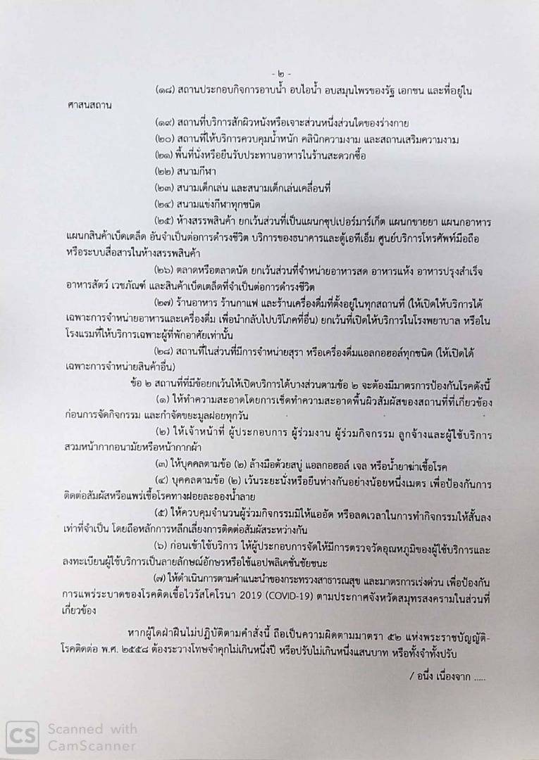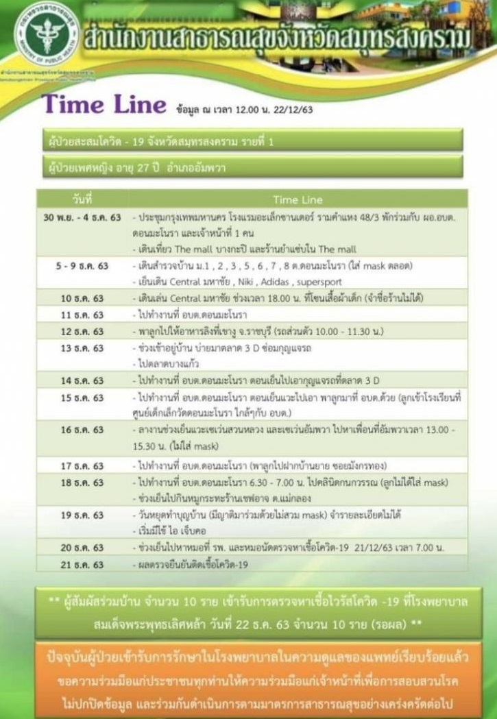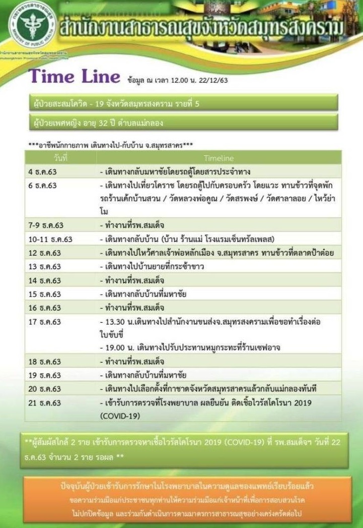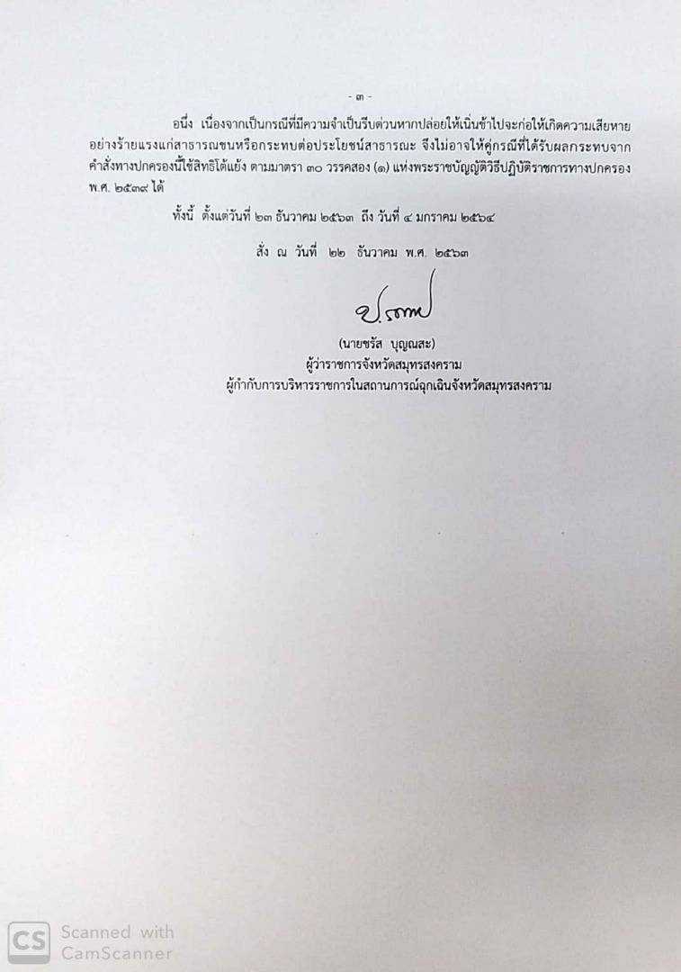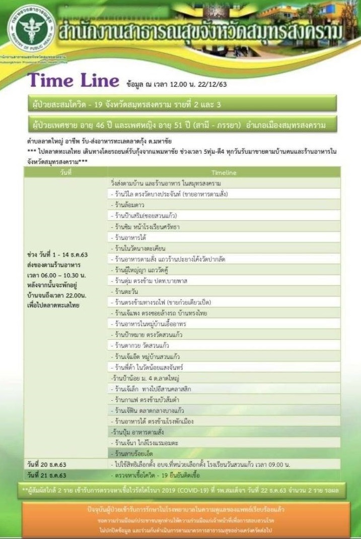 นายชรัส บุญณสะ ผู้ว่าราชการจังหวัดสมุทรสงคราม แถลงยืนยันผลตรวจหาเชื้อ COVID-19 ครั้งที่ 2 พบผู้ติดเชื้อ 6 คน รอผลอีก 2 คน ทั้งหมดเป็นคนไทย ได้แก่ -ผู้ป่วยหญิง อายุ 27 ปี อยู่ที่ อ.อัมพวา และทำงานที่ อบต.ดอนมะโนรา พบประวัติเดินห้างสรรพสินค้า The mall บางกะปิ, Central มหาชัย, ร่วมประชุมในโรงแรม, กินหมูกะทะที่ร้าน -ผู้ป่วยชายอายุ 46 ปี และหญิงอายุ 51 ปี สามีภรรยา อยู่ที่ อ.เมืองสมุทรสงคราม อาชีพรับส่งอาหารทะเลตลาดกุ้ง ต.มหาชัย พบประวัติเดินทางโดยรถยนต์รับกุ้งจากแพมหาชัย ช่วงเวลา 23.00-04.00 น. ของทุกวัน เพื่อขายตามบ้านและร้านอาหารใน จ.สมุทรสงคราม -ผู้ป่วยชาย อายุ 52 ปี อาชีพขายของที่ตลาดนัด อยู่ที่ อ.เมืองสมุทรสงคราม พบประวัติไปซื้อของสดที่ตลาดยายพ่วง -ผู้ป่วยหญิง อายุ 32 ปี อาชีพนักกายภาพ ทำงานที่ รพ.สมเด็จ เดินทางไปกลับบ้านที่ จ.สมุทรสาคร พบประวัติเดินทางกลับมหาชัยโดยรถตู้โดยสารประจำทาง, ไปเที่ยว จ.นครราชสีมา กับครอบครัว โดยแวะสถานที่ท่องเที่ยวสำคัญ เช่น วัดหลวงพ่อคูณ วัดศาลาลอย ไหว้ย่าโม, กินหมูกะทะที่ร้าน, เดินทางไปเลือกตั้งที่กาชาดจังหวัดสมุทรสาคร โดยมีผู้สัมผัสใกล้ชิด 2 คน อยู่ระหว่างรอผลตรวจหาเชื้อ -ผู้ป่วยชายอายุ 45 ปี อยู่ที่ อ.เมืองสมุทรสงคราม ประวัติเดินทางไปตลาดกลางกุ้งมหาชัย จ.สมุทรสาคร และไปงานปลาทู นอกจากนี้ ผู้ว่าราชการจังหวัดสมุทรสงคราม มีคำสั่งล็อกดาวน์จังหวัด 13 วัน ตั้งแต่วันที่ 23 ธ.ค.2563 – 4 ม.ค.2564 โดยมีผลให้ปิด 28 สถานที่ เช่น สถานบริการ สถานที่เล่นพนันชนไก่และกัดปลา โรงภาพยนตร์ คาราโอเกะ ศูนย์พัฒนาเด็กเล็ก สถานศึกษาทุกแห่ง สถาบันกวดวิชา ฟิตเนส สปา ห้างสรรพสินค้า ยกเว้นแผนกซูเปอร์มาร์เก็ต แผนกขายยา แผนกอาหาร ปิดตลาด หรือตลาดนัด ยกเว้นที่จำหน่ายอาหาร เวชภัณฑ์ ส่วนร้านอาหาร ร้านกาแฟ ให้ซื้อกลับบ้าน