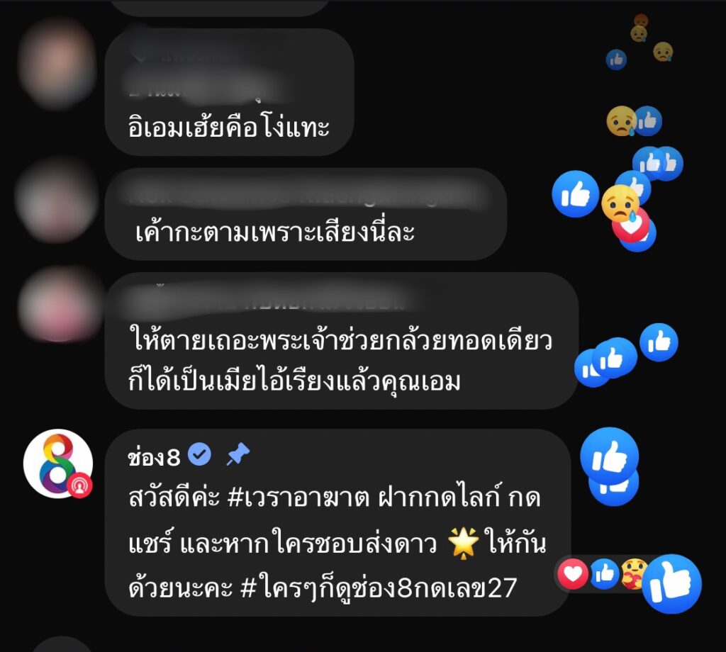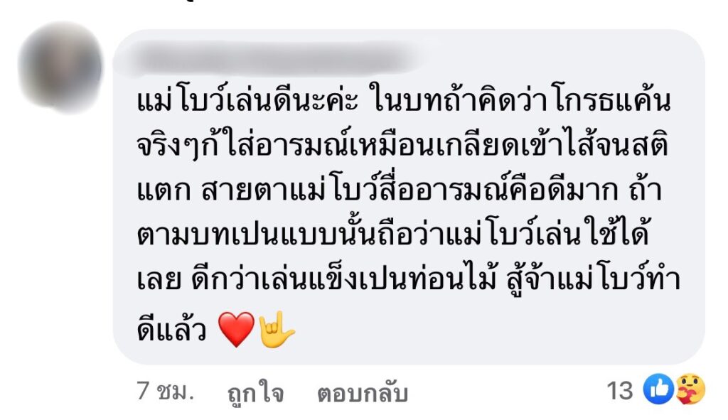 โบว์ เผยว่า “ก็มีคนส่งมาให้เห็นเหมือนกัน เหมือนคนดูไลฟ์สดในเพจช่อง 8 เค้าก็จะสามารถมีฟีดแบคกลับมาได้ทันที แล้วมันเป็นฉากที่เราโดนจับ ตอนแรกเหมือนทุกคนก็บอกให้เราหนีไป ลุ้นให้เรารอด พอหลังจากที่ สามีเราในเรื่องอย่างพี่เอ็ม ที่เค้าเล่นเป็นสนองโดนซ้อมจนเรืองฆ่าตาย เราก็ได้แต่ร้องกรี๊ด ๆ เท่านั้นแหละ รถทัวร์พร้อมมาจอด(หัวเราะ) แฟน ๆ อินหนักมารัวคอมเมนท์ว่า เอมทำไมโง่แบบนั้นแบบนี้ ก็คือจัดเต็มมาก แต่ไม่โกรธนะคะเพราะว่าเค้าคงอินในบทบาทที่เราได้แสดงไป แต่ก็มีเสียงที่ชมเหมือนกันว่า ไม่เคยเห็นเราเล่นบทแบบนี้ที่ไหนได้สู้คนได้ร้าย ได้ชี้หน้าด่า หัวเราะสะใจ ก็ขอบคุณทุกกระแสตอบรับมาก ๆ เลยนะคะ เพราะยอมรับเลยว่าตอนถ่ายทำซีนพวกนี้ ยากมากเราเองก็ใหม่มาก ๆ กับทางด้านอาชีพนี้ การที่จะถ่ายทอดบทบาทออกมาให้อินเราทำการบ้านเยอะมาก ขอบคุณผู้กำกับ ขอบคุณทุกๆคนทีช่วยผลักดันโบว์ และเชื่อมั่นว่าเราทำได้ ถามว่าชอบไหม ชอบนะ โบว์คิดว่า ในเรื่องการแสดง เป็นอีกหนึ่งสิ่งที่เราก็ฝันไว้ตั้งแต่เด็กๆ แล้วพอเราได้รับโอกาส เราทำมันเต็มที่ ทุกครั้งที่เราทำมันเต็มที่ ผลมันจะออกมายังไง เราก็รู้สึกว่า เราได้ทำเต็มที่แล้วแหละ แต่เราก็คาดหวังอยากจะให้ผู้ชมชอบ แต่พอทุกอย่างออกมาดีก็รู้สึกดีใจและอยากจะขอบคุณทุกคนจากหัวใจจริง ๆ ค่ะ ต้องติดตามต่อว่าเอมอีกโหมดนึง จะน่ากลัวขนลุกแค่ไหนเพราะต้องเป็นผี มาหลอกหลอนคนชั่ว ติดตามได้ ในละคร “เวราอาฆาต” ออกอากาศทุกวันจันทร์-พฤหัสบดี เวลา 19.00 น. ทางช่อง 8 กดเลข 27 รับรองว่าหลอน จนต้องเปิดไฟนอนเลยค่ะ ”