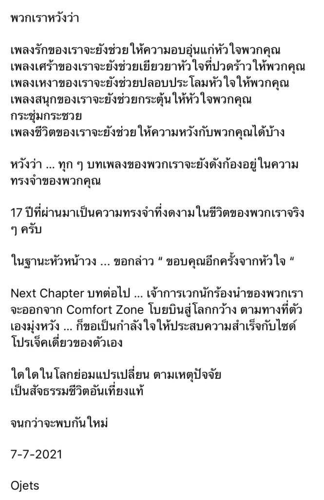 Next Chapter บทต่อไป … เจ้าการเวกนักร้องนำของพวกเรา จะออกจาก Comfort Zone โบยบินสู่โลกกว้าง ตามทางที่ตัวเองมุ่งหวัง … ก็ขอเป็นกำลังใจให้ประสบความสำเร็จกับไซด์โปรเจ็คเดี่ยวของตัวเอง
