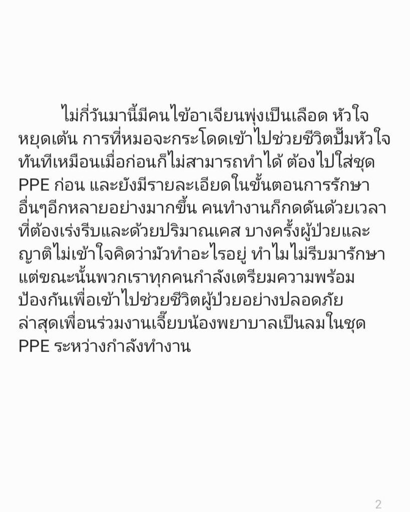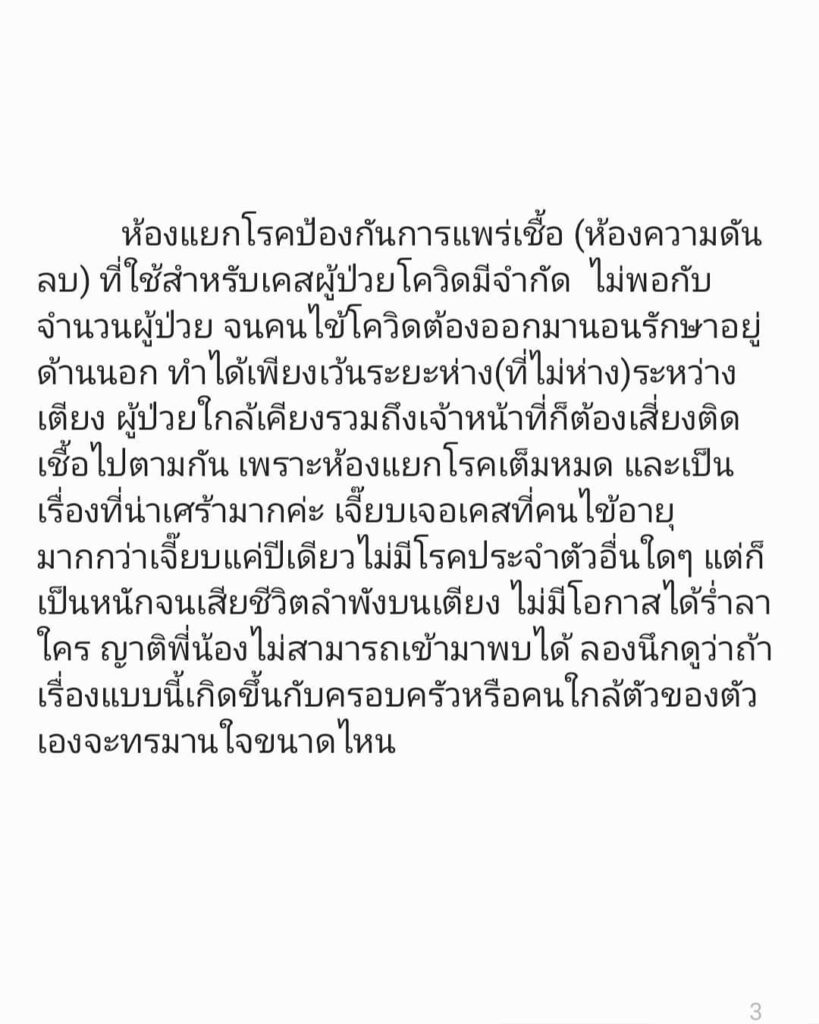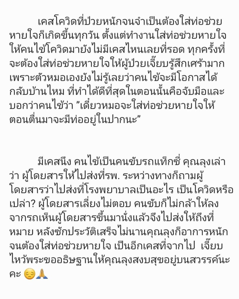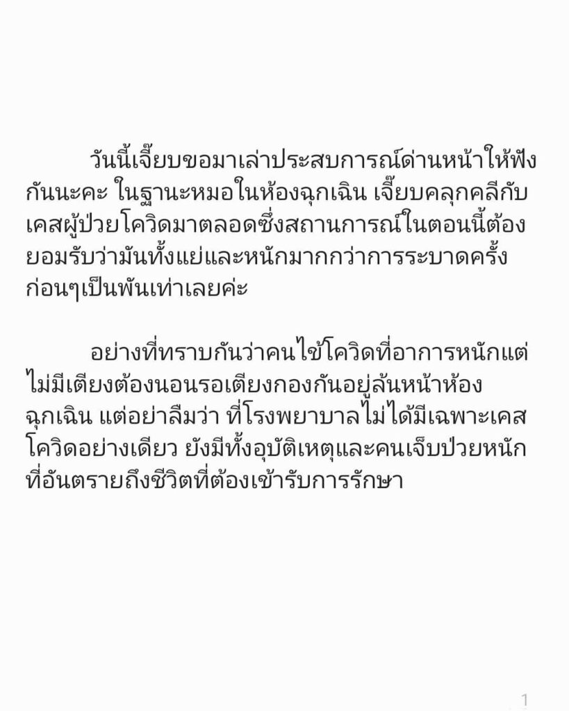 หมอเจี๊ยบ – ลลนา หรือ แพทย์หญิง ลลนา ก้องธรนินทร์  โพสต์ข้อความลงอินสตาแกรมส่วนตัว เล่าประสบการณ์การทำงานด่านหน้า คลุกคลีกับผู้ป่วยโควิดมาตลอด ซึ่งสถานการณ์ตอนนี้ต้องยอมรัยว่าทั้งแย่และหนักมากกว่าการระบาดครั้งที่ผ่านมาเป็นพันเท่า เนื่องจากตอนนี้มีจำนวนผู้ติดเชื้อเพิ่มสูงขึ้น และไม่มีเตียงเพียงพอสำหรับรองรับผู้ป่วยโควิด และที่โรงพยาบาลไม่ได้มีเพียงแค่เคสของผู้ป่วยโควิดเพียงอย่างเดียว ส่งผลให้บุคลากรทางการแพทย์ต้องทำงานกันอย่างหนักเพิ่มขึ้นเป็นหลายเท่า จำนวนผู้ป่วยโควิดที่ต้องนอนรักษาอยู่ด้านนอกมีจำนวนมาก ทำให้ผู้ป่วยใกล้เคียงรวมถึงเจ้าหน้าที่ก็เสี่ยงติดเชื้อไปด้วย ซึ่งถือว่าเป็นเรื่องที่น่าเศร้ามาก และพบว่าเคสโควิดที่ป่วยหนักต้องใส่ท่อช่วยหายใจเกิดขึ้นทุกวัน และตั้งแต่ทำงานใส่ท่อช่วยหายใจคนไข้โควิดยังไม่มีเคสไหนเลยที่รอด ซึ่งทุกครั้งที่ต้องใส่ท่อช่วยหายใจ ตนรู้สึกเศร้ามาก เพราะตนเองยังไม่รู้เลยว่าคนไข้จะมีโอกาสได้กลับบ้านไหม ทำได้เพียงจับมือและให้กำลังใจคนไข้ สถานการณ์ตอนนี้หนักมาก บางเคสอายุไม่เยอะ ไม่มีโรคประจำตัวมาก่อนก็มีโอกาสอาการหนักได้ ความเสี่ยงมีอยู่ทุกที่ ตนขอเป็นหนึ่งเสียงในฐานะแพทย์และประชาชนคนหนึ่ง ขอวัคซีนที่มีประสิทธิภาพและทั่วถึงให้ประชาชนทุกคนอย่างเร็วที่สุด เพราะแต่ละวินาทีที่ช้าไปคือชีวิต หมอทุกคนอยากเห็นคนไข้ได้กลับบ้านไปหาคนที่เขารัก