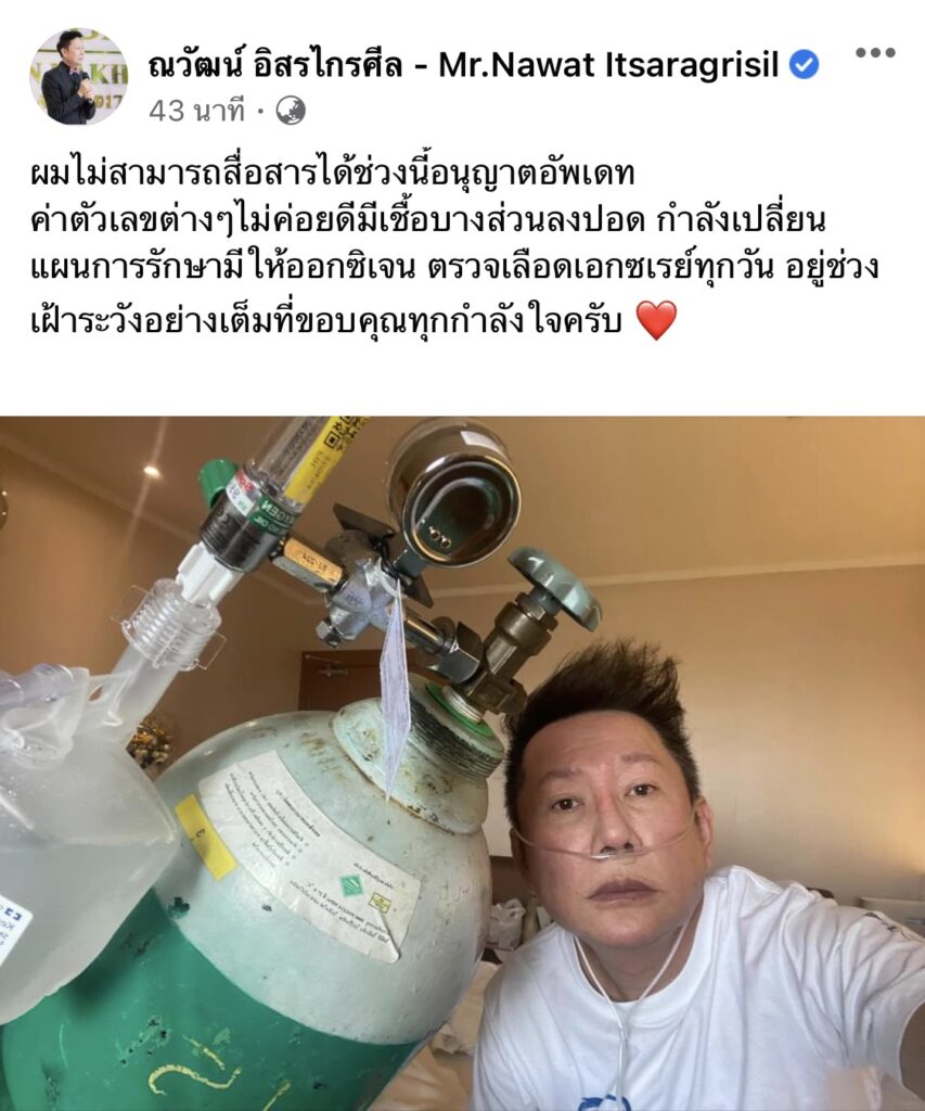“ผมไม่สามารถสื่อสารได้ในช่วงนี้ อนุญาตอัพเดท ค่าตัวเลขต่างๆไม่ค่อยดีมีเชื้อบางส่วนลงปอด กำลังเปลี่ยนแผนการรักษามีให้ออกซิเจน ตรวจเลือดเอกซเรย์ทุกวัน อยู่ช่วงเฝ้าระวังอย่างเต็มที่ขอบคุณทุกกำลังใจครับ”