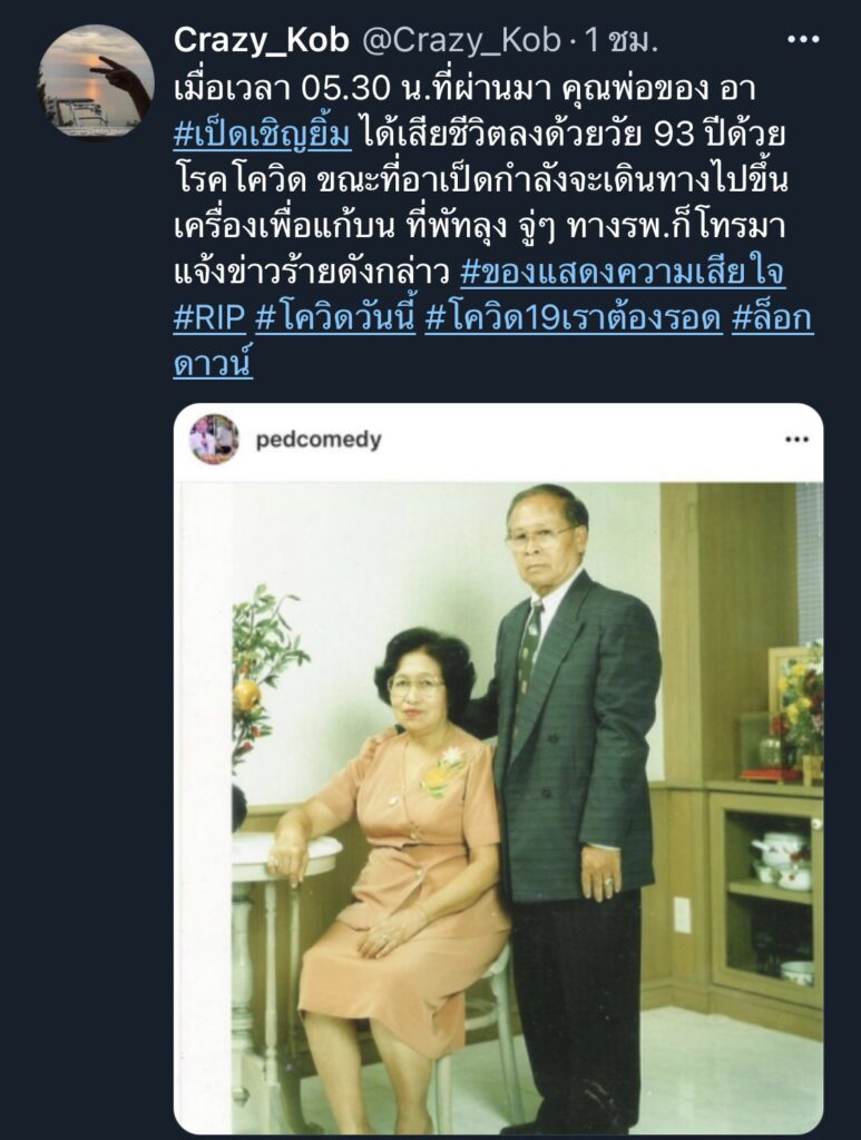 โดยทวิตเตอร์ที่ใช้ชื่อว่า Crazy_Kob ได้แจ้งข่าวเศร้าดังกล่าวระบุว่า “เมื่อเวลา 05.30 น.ที่ผ่านมา คุณพ่อของอา #เป็ดเชิญยิ้ม ได้เสียชีวิตลงด้วยวัย 93 ปีด้วยโรคโควิด ขณะที่อาเป็ดกำลังจะเดินทางไปขึ้นเครื่องเพื่อแก้บน ที่พัทลุง จู่ๆ ทางรพ.ก็โทรมาแจ้งข่าวร้ายดังกล่าว #ขอแสดงความเสียใจ #RIP #โควิดวันนี้ #โควิด19เราต้องรอด #ล็อกดาวน์”
