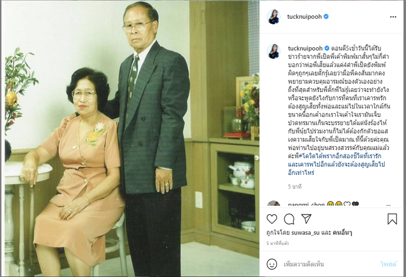 “ตอนตี5เช้าวันนี้ได้รับข่าวร้ายจากพี่เป็ดพี่เค้าพิมพ์มาสั้นๆไม่กี่คำบอกว่าพ่อพี่เสียแล้วแค่4คำพี่เป็ดยังพิมพ์ผิดๆถูกๆเลยตั๊กรู้เลยว่ามือพี่คงสั่นมากคงพยายามควบคุมอารมณ์ของตัวเองอย่างถึงที่สุด สำหรับพี่ตั๊กพี่ไม่รู้เลยว่าจะทำยังไงหรือจะพูดยังไงกับการที่คนที่เราเคารพรักต้องสูญเสียทั้งพ่อและแม่ไปในเวลาใกล้กันขนาดนี้ อกเค้าอกเรา ใจเค้าใจเรามันเจ็บปวดทรมานเกินจะบรรยาย ได้แต่นั่งร้องไห้กับพี่นุ้ย ไปร่วมงานก็ไม่ได้ต้องกักตัว ขอแสดงความเสียใจกับพี่เป็ดมา ณ.ที่นี้ด้วยค่ะ คุณพ่อท่านไปอยู่บนสรวงสวรรค์กับคุณแม่แล้วค่ะพี่ #โควิดได้พรากอีกสองชีวิตที่เรารักและเคารพไปอีกแล้วยังจะต้องสูญเสียไปอีกเท่าไหร่”