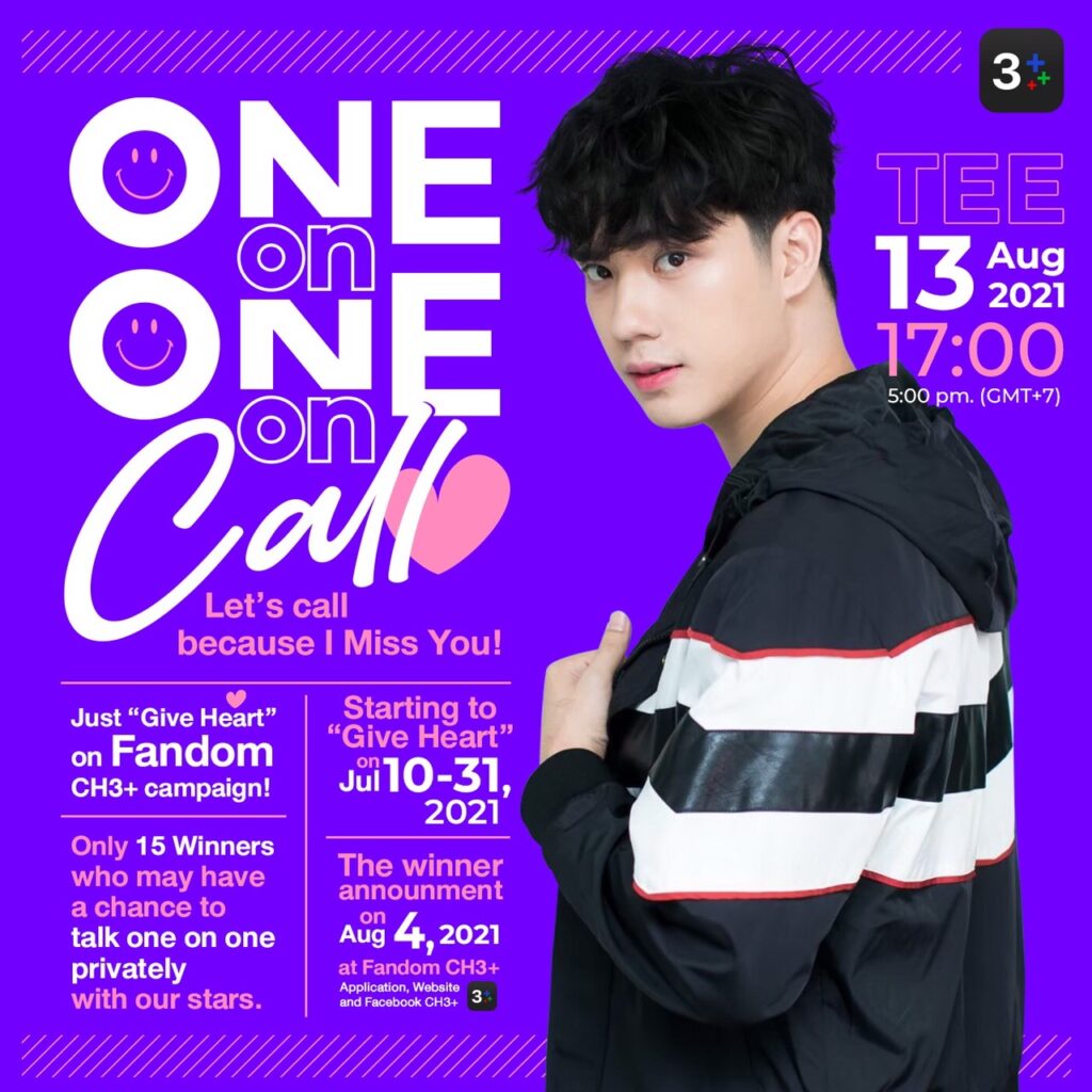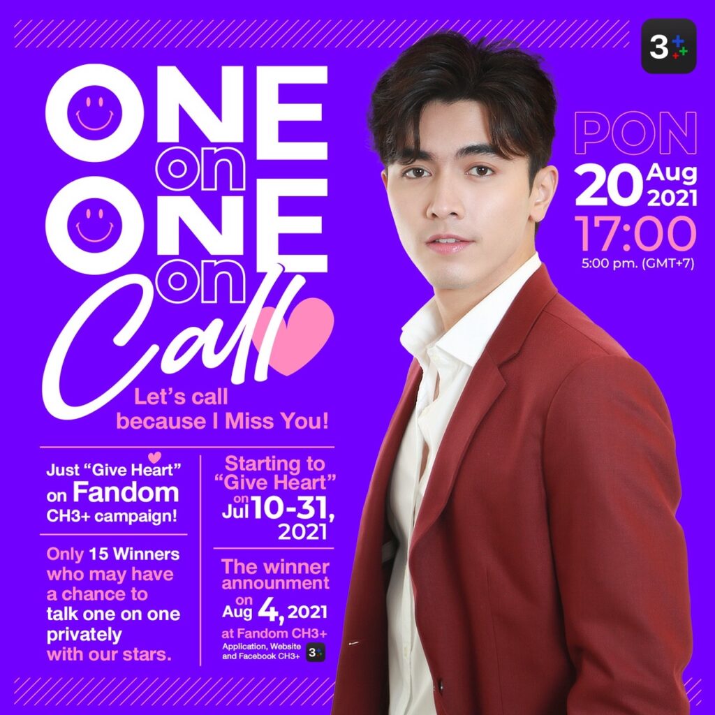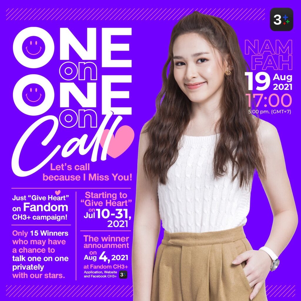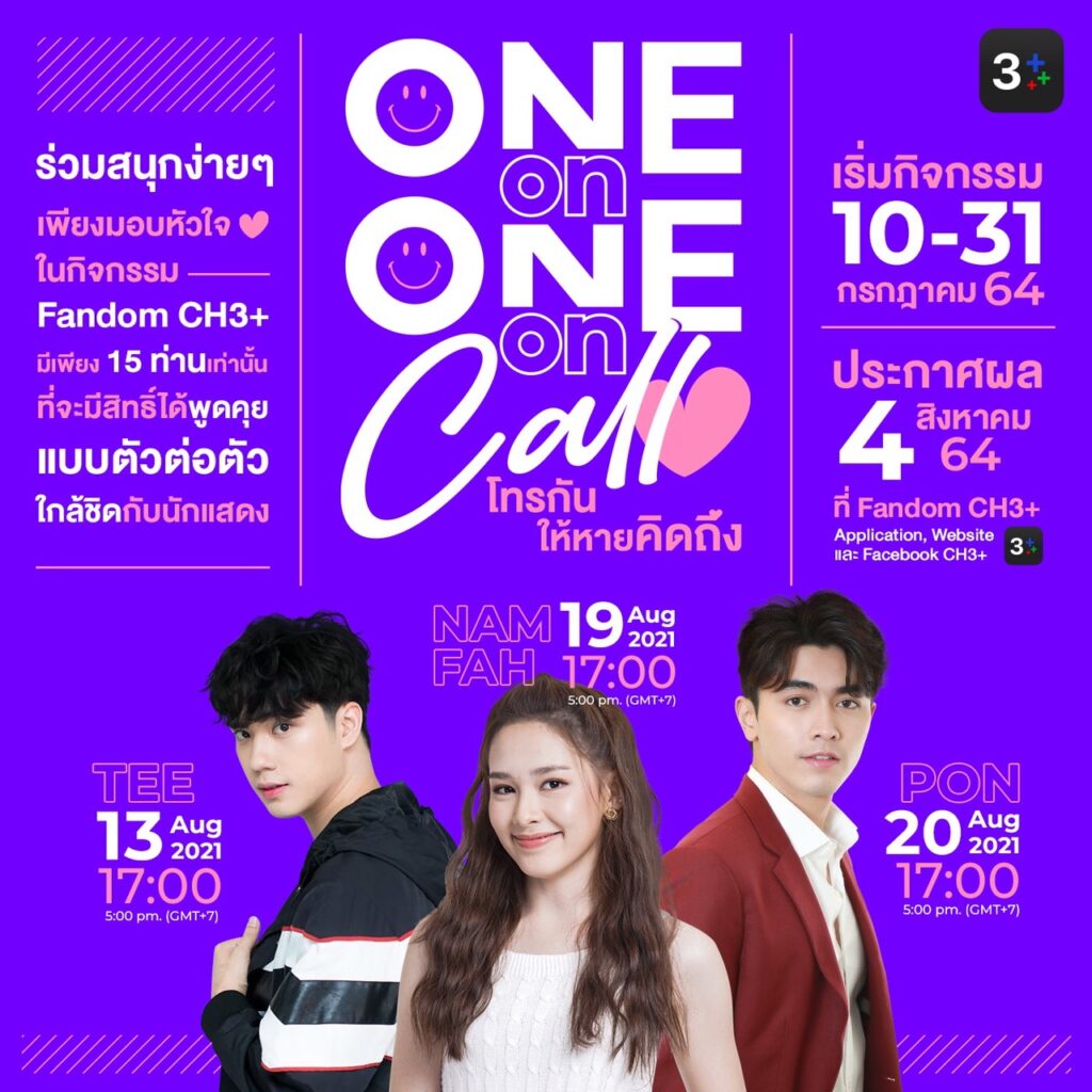 ทั้งนี้ “ONE on ONE on Call โทรกันให้หายคิดถึง” จะจัดขึ้นในเวลา 17.00 น. ตามเวลาประเทศไทย โดย ตี๋ ธนพล call วันที่ 13 สิงหาคม , น้ำฟ้า ธัญญภัสร์ call วันที่ 19 สิงหาคม และ ภณ ณวัสน์ call วันที่ 20 สิงหาคม พลาดไม่ได้! ใครเป็นแฟนตัวยง เตรียมกดมอบหัวใจไม่ยั้ง! ทางแอปพลิเคชั่น CH3Plus เท่านั้น ติดตามรายละเอียดเพิ่มเติม พร้อมกฎกติกา ได้ที่ https://ch3plus.com/fandom
