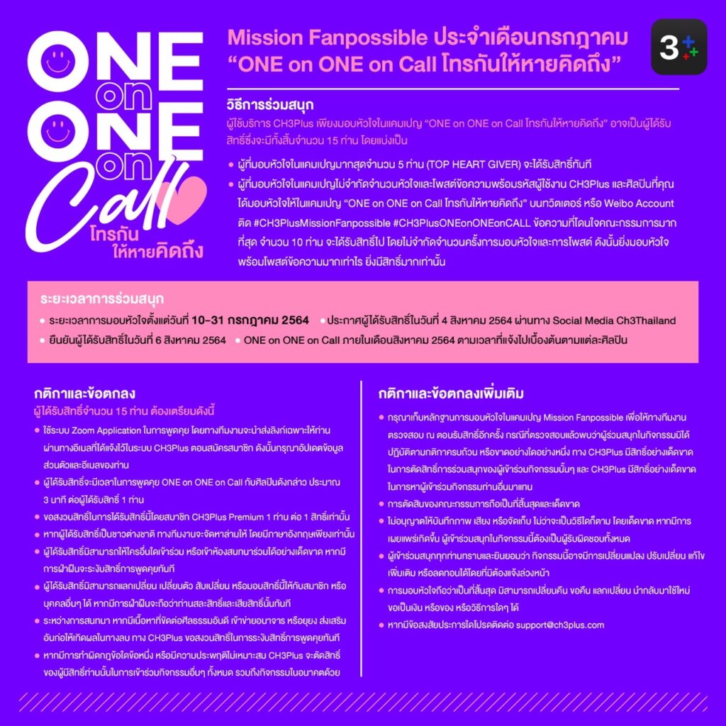 โดยวิธีการร่วมสนุกเพียงท่านเป็นผู้ใช้บริการ แอปพลิเคชั่น CH3Plus ในรูปแบบสมาชิกPremium และกดส่งมอบหัวใจ “Give Heart” ในแคมเปญ “ONE on ONE on Call โทรกันให้หายคิดถึง”ในหน้า Fandom ของแอปพลิเคชั่น CH3Plus ผู้ที่มอบหัวใจในแคมเปญมากสุดจำนวน 5 ท่าน (Top Heart Giver) จะได้รับสิทธิ์ทันที นอกจากนี้สำหรับผู้ที่มอบหัวใจในแคมเปญไม่จำกัดจำนวนหัวใจ และโพสต์ข้อความพร้อมรหัสผู้ใช้งาน CH3Plus บนทวิตเตอร์ หรือ Weibo Account ติด #CH3PlusMissionFanpossible #CH3PlusONEonONEonCALL ข้อความที่โดนใจคณะกรรมการมากที่สุด จำนวน 10 ท่าน จะได้รับสิทธิ์ไป โดยที่ไม่จำกัดจำนวนครั้งการมอบหัวใจและการโพสต์ ดังนั้น ยิ่งมอบหัวใจพร้อมโพสต์ข้อความมากเท่าไร ยิ่งมีสิทธิ์มากเท่านั้น รวมสิทธิ์ทั้งสิ้นเป็นจำนวน 15 ท่านต่อหนึ่งศิลปินดารา โดยมีระยะเวลาการมอบหัวใจเริ่มตั้งแต่วันที่ 10 – 31 กรกฏาคม 2564 ประกาศผู้ได้รับสิทธิ์ ในวันที่ 4 สิงหาคม 2564 และยืนยันสิทธิ์ ในวันที่ 6 สิงหาคม 2564