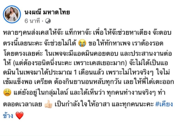 “หลายๆ คนส่งเคสให้จ๊ะ แท็กหาจ๊ะ เพื่อให้จ๊ะช่วยหาเตียง จ๊ะตอบตรงนี้เลยนะคะ จ๊ะช่วยไม่ได้ ขอให้ทักหาเพจ เราต้องรอด โดยตรงเลยค่ะ ในเพจจะมีแอดมินคอยตอบ และประสานงานต่อให้ (แต่ต้องรอนิดนึ่งนะคะ เพราะเคสเยอะมาก) จ๊ะไม่ได้เป็นแอดมินในเพจมาได้ประมาณ 1 เดือนแล้ว เพราะไม่ไหวจริงๆ ใจไม่เข้มแข็งพอ เครียด ต้องกินยานอนหลับทุกวัน เลยให้พี่ได๋เตะออก แต่ยังอยู่ในกลุ่มไลน์ และได้เห็นว่า ทุกคนทำงานจริงๆ ทำตลอดเวลาเลย เป็นกำลังใจให้อาสา และทุกคนนะคะ #เคียงข้าง ❤”
