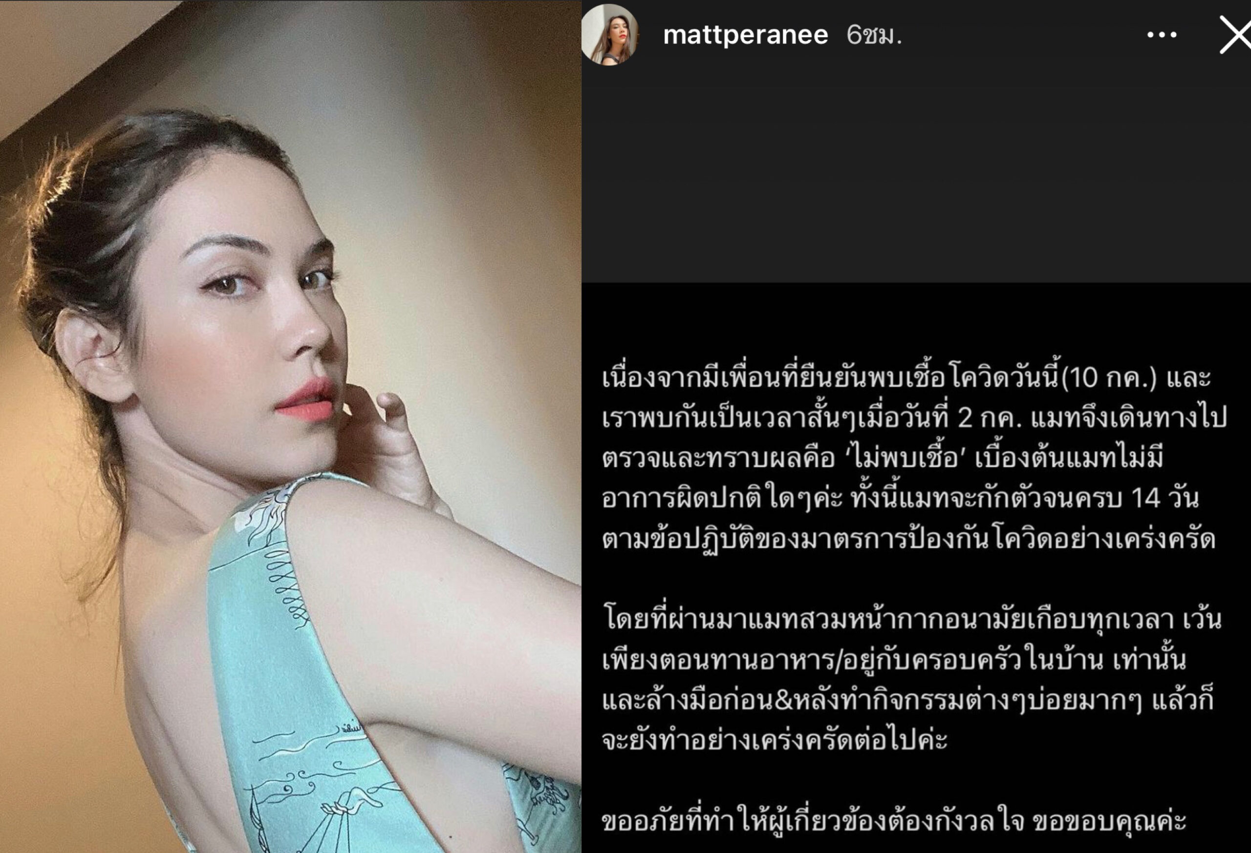 นอกจากนี้แมท ยังเปิดเผยอีกว่า ที่ผ่านมาตนสวมแมสก์แทบจะทุกเวลา ยกเว้นตอนทานข้าวและอยู่บ้านกับครอบครับอีกทั้งยังล้างมือก่อนและหลังทำกิจกรรมต่างๆบ่อยมาก และจะทำต่อไปอย่างเคร่งครัด พร้อมขอโทษทุกๆคนที่เกี่ยวข้องที่ทำให้ต้องกังวลใจด้วย