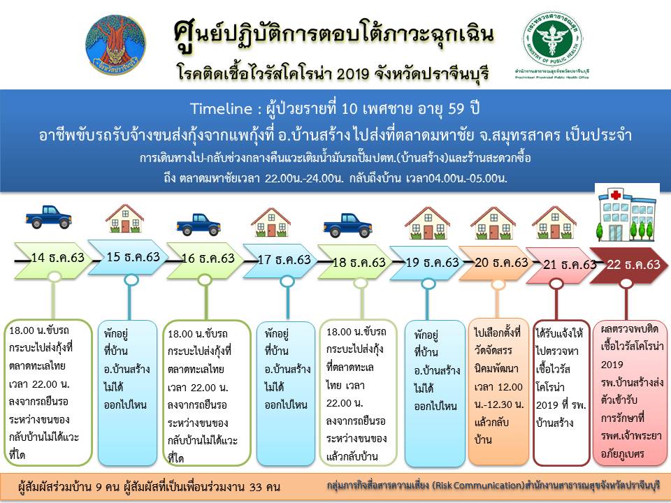 ผู้สัมผัสร่วมบ้าน 4 คน ผู้สัมผัสใกล้ชิด 1 คน ผู้สัมผัสร่วมงาน 1 คน และผู้สัมผัสใกล้ชิดที่เป็นเพื่อนร่วมงาน 30 คน ผู้ป่วยติดเชื้อโควิด-19 รายที่ 2 Timeline ผู้ป่วยรายที่ 11 ของ จ.ปราจีนบุรี เพศชาย ชายอายุ 59 ปี ไปส่งที่ตลาดมหาขัย จ.สมุทรสาคร เป็นประจำ การเดินทางไป-กลับช่วงเวลากลางคืนแวะเติมน้ำมันรถปั๊ม ปตท.(บ้านสร้าง) และร้านสะดวกซื้อถึงตลาดมหาชัยเวลา22.00 น.-24.00 น.กลับถึงบ้านเวลา 04.00 น.-05.00 น. ในวันที่ 14 ธ.ค. ขับรถกระบะไปส่งกุ้งที่ตลาดทะเลไทยเวลา 22:00 น ลงจากรถยืนรอระหว่างขนของกลับบ้านไม่ได้แวะที่ใด วันที่ 15 ธ.ค.63 พักที่บ้าน อ.บ้านสร้างไม่ได้ออกไปไหน วันที่ 16 ธ.ค.63เวลา 18.00 น.ขับรถกระบะไปส่งกุ้งที่ตลาดทะเลไทย เวลา 22.00 น.ลงจากรถยืนรอระหว่างขนของกลับบ้านไม่ได้แวะที่ใด วันที่ 17 ธ.ค.63 พักอยู่ที่บ้าน อ.บ้านสร้าง ไม่ได้ไปไหน วันที่ 18ธ.ค.63 เวลา 18.00 น.ขับรถไปส่งกุ้งที่ตลาดทะเลไทย เวลา22.00 น.ลงจากรถอยู่รอระหว่างขนของแล้วกลับบ้าน วันที่ 19 ธ.ค.63 พักอยู่ที่บ้าน อ.บ้านสร้างไม่ได้ออกไปไหน วันที่ 20 ธ.ค.63 ไปเลือกตั้งที่วัดจัดสรรนิคมพัฒนา เวลา 12.00 น.-12.30 น. แล้วกลับบ้าน วันที่ 21 ธ.ค.63 ได้รับแจ้งให้ไปตรวจหาเชื้อไวรัสโคโรนา 2019 ที่โรงพยาบาลบ้านสร้าง วันที่ 22 ธ.ค.63 ผลตรวจพบติดเชื้อไวรัสโคโรน่า 2019 รพ.บ้านสร้างส่งตัวเข้ารับการรักษาที่รพ.เจ้าพระยาอภัยภูเบศรผู้สัมผัสร่วมบ้าน 9 คน ผู้สัมผัสที่เป็นเพื่อนร่วมงาน 33 คน